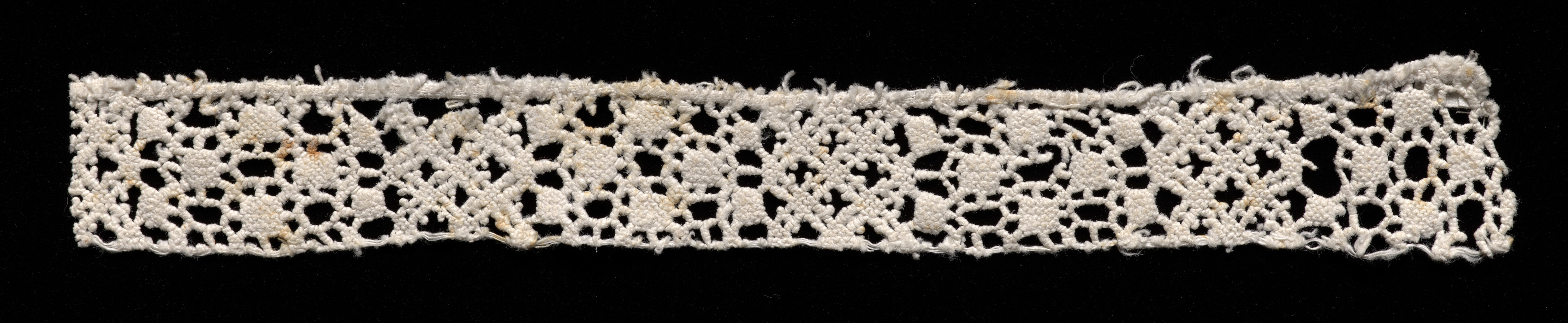 White lace strip with a repeating pattern of interconnected loops and holes, frayed edges, against a black background.