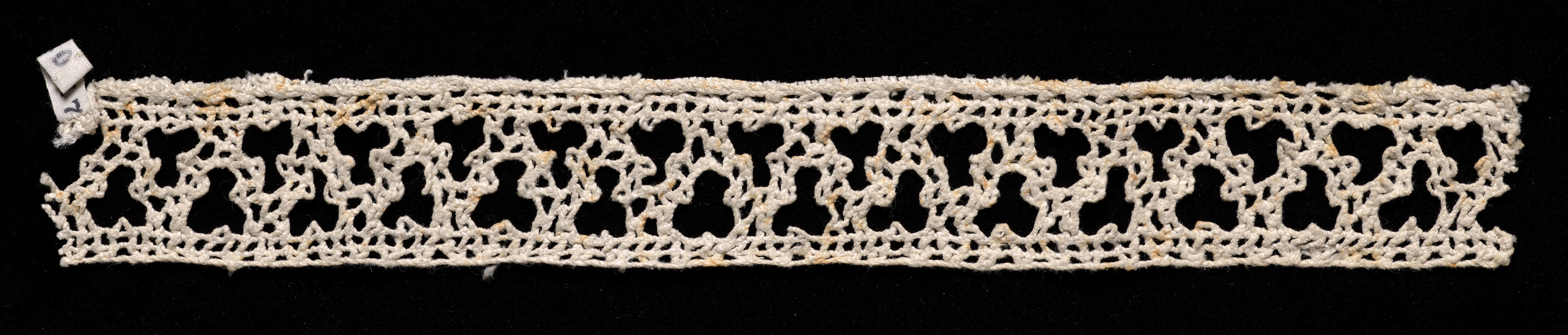 Long, thin, off-white lace strip with intricate, woven design. The lace has a repeating pattern of interconnected loops and curves, resembling flowers or leaves; some areas are more densely woven than others. The top and bottom edges are rough and uneven. A small white tag is attached to the top left corner of the lace. The background is solid black. The lace is titled "Bobbin Lace Insertion" and is by an unknown artist.