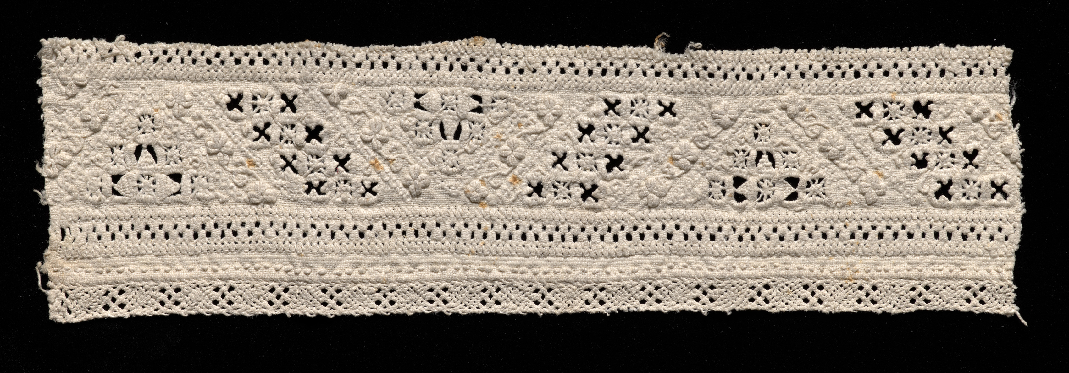 White rectangular piece of needlepoint lace with cutwork and drawnwork. The piece is long and thin. It has a row of small triangles pointing downwards and upwards on the top edge. The main body consists of repeating patterns of white thread on a black background, divided into sections by horizontal rows of holes. The sections contain various geometric and floral patterns created by white thread and cutouts. The bottom edge has a repeating pattern of small holes and white thread. The background of the image is black.