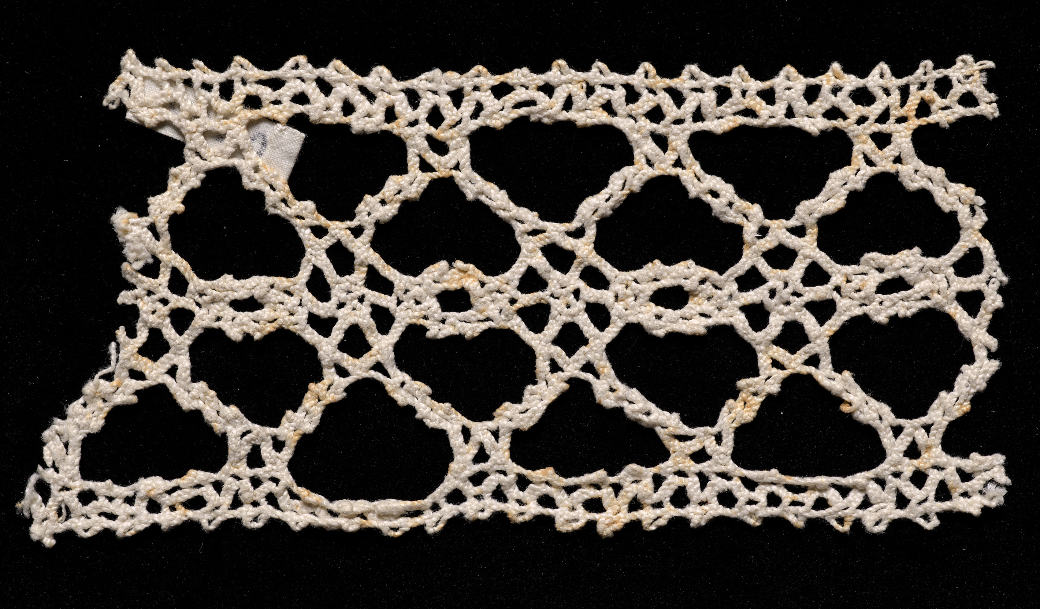 White crocheted lace piece with a repeating pattern of interconnected circles and ovals. The lace is made up of rows of crocheted loops that form a series of open, rounded shapes. The background is solid black. The lace piece, Bobbin Lace Insertion, has a few small, light-brown spots scattered throughout. A small piece of white fabric is attached to the top left corner of the lace. The lace appears to be a delicate, intricate piece.