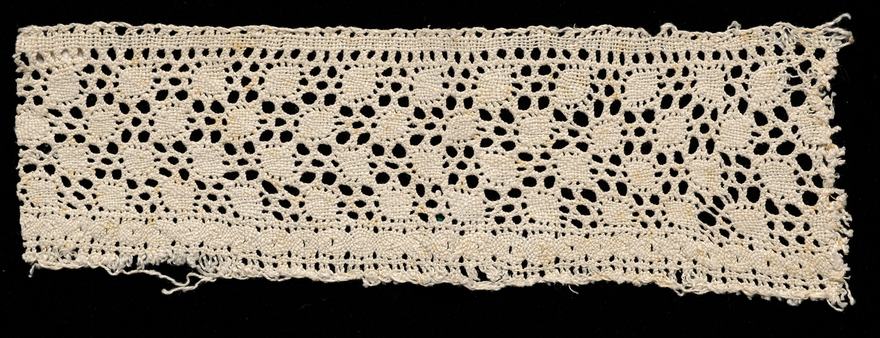 The image shows a piece of off-white bobbin lace on a black background. The lace is rectangular, wider than it is tall, and made of a cream-colored thread. The top and bottom edges are frayed and uneven. The lace features an intricate pattern of interconnected loops and holes. The pattern consists of rows of small, rounded shapes with holes in the center. The rows are separated by a line of smaller holes. The lace appears to be handmade, with visible signs of manual craftsmanship. The background is solid black, providing high contrast to the lace. The title of the piece is "Bobbin Lace Insertion". The artist is not specified.