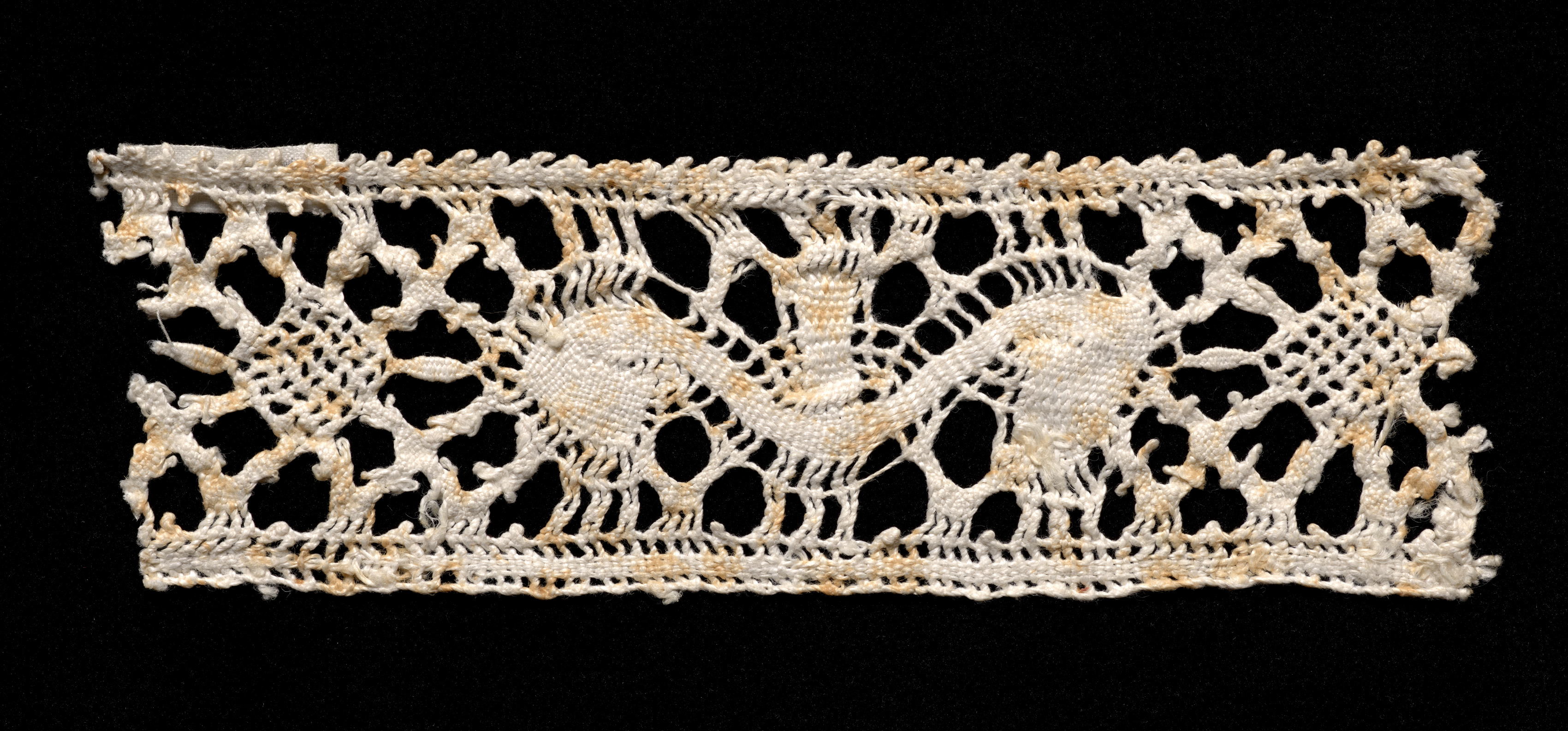 White bobbin lace with floral and leaf-like pattern, featuring a repeating design of curved lines and shapes; top and bottom edges have a scalloped border; lace appears slightly yellowed and has some darker spots; rectangular shape with a flat top and bottom; background is solid black. Bobbin Lace Insertion.