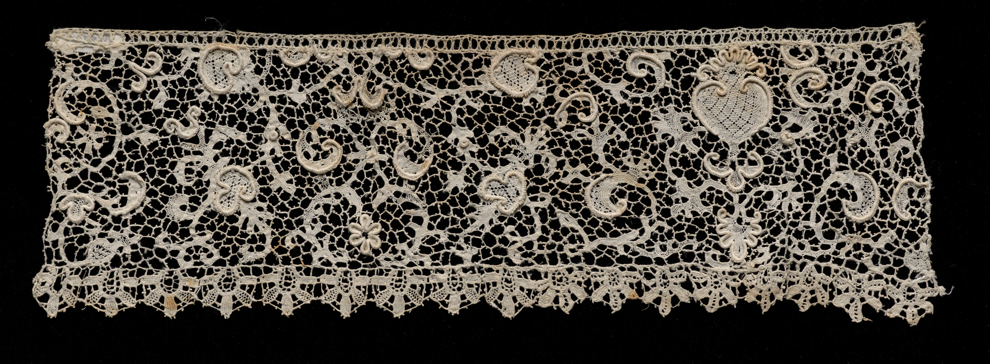 The image shows a long, rectangular piece of off-white needlepoint lace with a floral pattern. The lace has a solid top edge with small loops. The main body of the lace features a repeating design of floral motifs, leaves, and scrolls. There is a row of small holes and a scalloped edge along the bottom. The lace is set against a solid black background. The lace style is identified as Point de France. The lace appears to be made by an unknown artist.