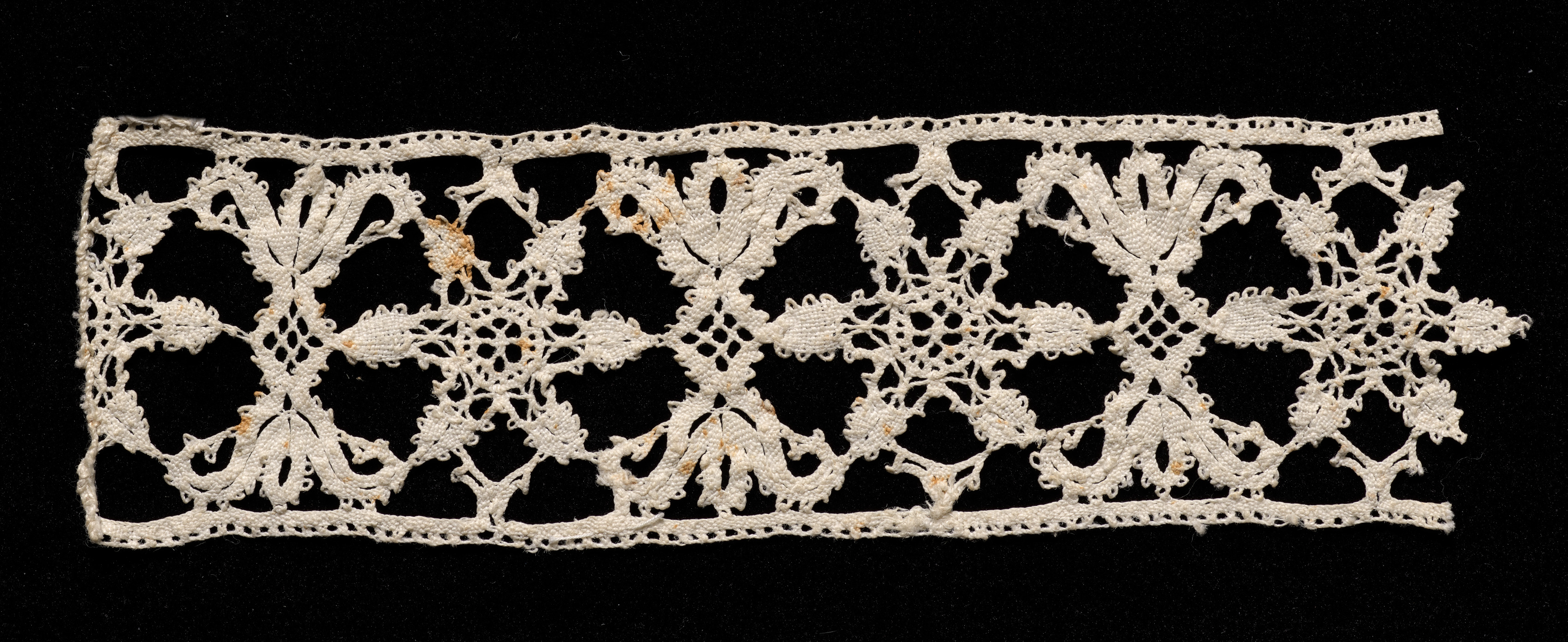 White lace with a repeating pattern on a black background, Bobbin Lace Insertion. The lace has a rectangular shape with a straight top and bottom edge and wavy sides. The lace has a floral and leaf-like design made of intricate holes and loops. The design is symmetrical with a central flower-like pattern on the left, center and right. The lace appears slightly damaged with a few brown spots. The lace has a decorative border along the top and bottom edges. The border consists of small holes. The lace appears to be made from a thin white fabric. The black background provides high contrast to the white lace.