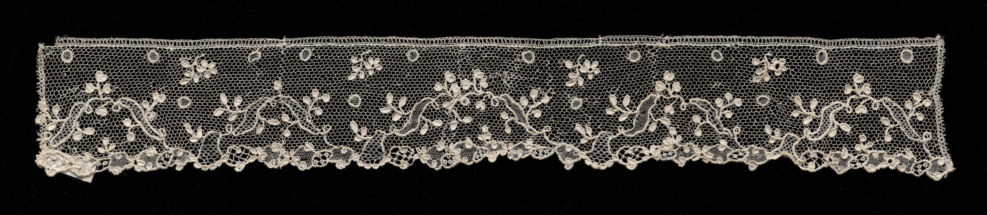 White lace edging with a floral design and scalloped bottom. The lace is composed of a mesh background with floral motifs and curving lines. The top edge has a straight line of small loops. The bottom edge has a wavy line with pointed scallops. The lace is long and rectangular in shape. Against a black background. The work is titled "Needlepoint (Point Alençon) Lace Edging".