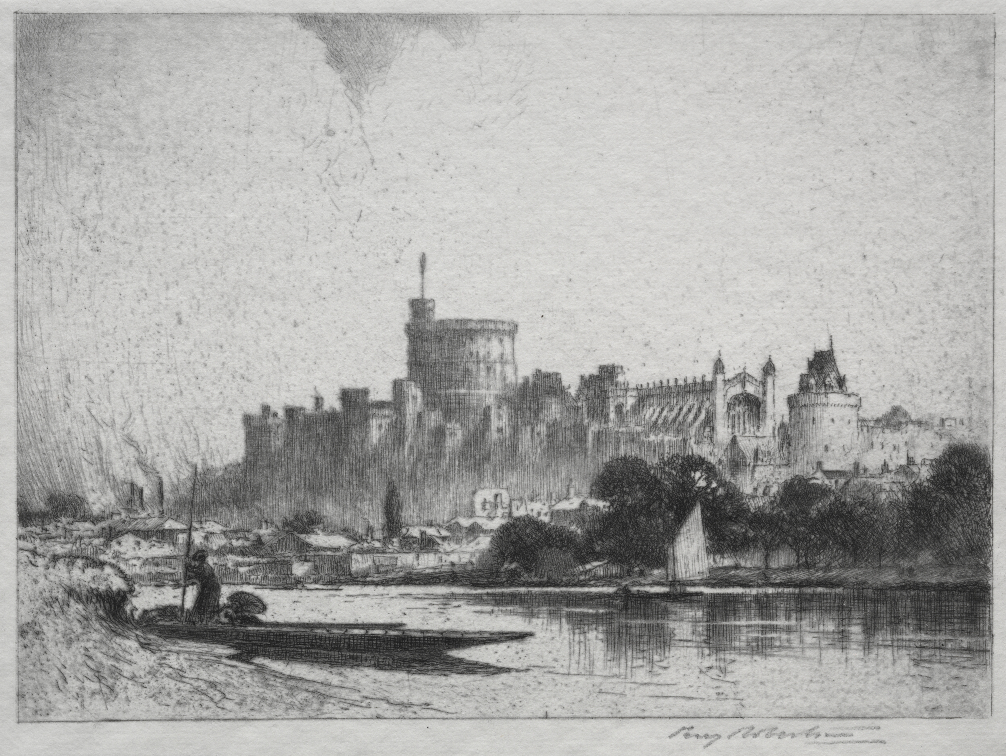Black and white image of a castle across a river. The castle has a large wall with a round tower on the left side and a smaller square tower on the right side. There are trees and bushes along the riverbank in the foreground and buildings on the left side. A boat with a person and a pile of material sits on the near shore. The artist's signature is at the bottom. The title of the work is "Windsor Castle" and the artist is Percy Robertson.