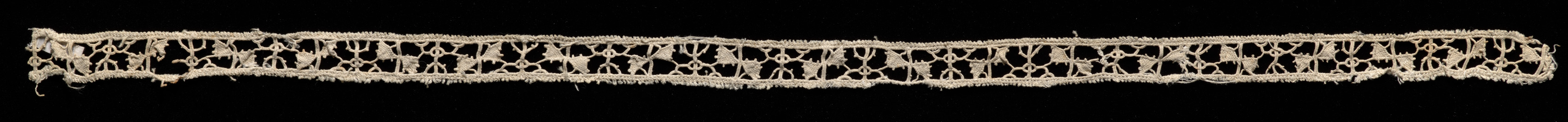 Long, narrow, beige-colored lace strip with a floral pattern on a black background. The lace has a frayed edge on both sides. The pattern consists of repeating floral motifs in a grid-like arrangement. The motifs are made up of a central flower with radiating petals, surrounded by curved leaves and stems. The lace is composed of interwoven threads, with visible stitching throughout. The overall design features symmetry and intricate detail. The title of the piece is "Needlepoint (Reticella) Lace Insertion".