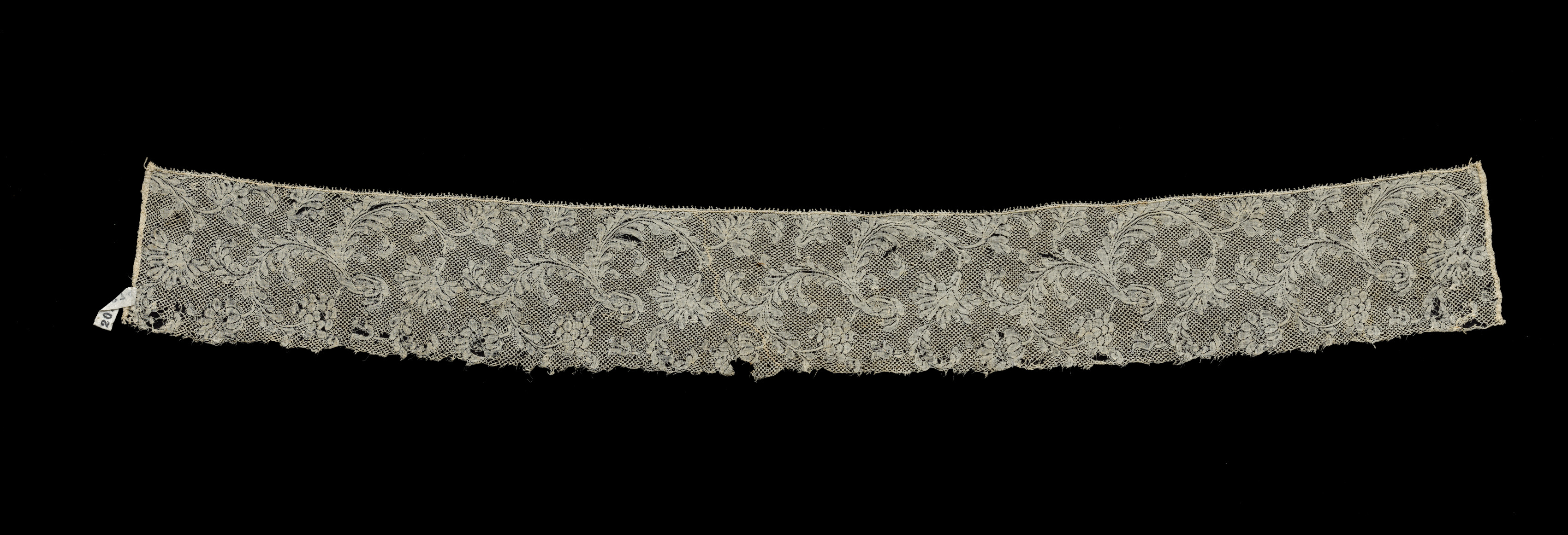 Bobbin Lace Insertion by an unknown artist. A long, curved piece of off-white lace with a floral pattern. The lace has a scalloped edge on the bottom. A small white tag is attached to the left end. The background is black.