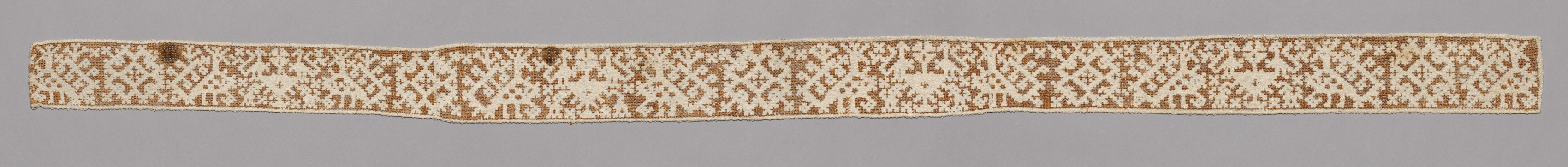 Long, narrow, rectangular piece of fabric with intricate brown and cream-colored design. The fabric has a repeating pattern of interlocking shapes and lines. The background of the fabric is cream-colored, while the design is brown. The fabric appears to be made of a delicate material, possibly lace or needlepoint. The edges of the fabric are rough and uneven. The fabric is set against a solid gray background.