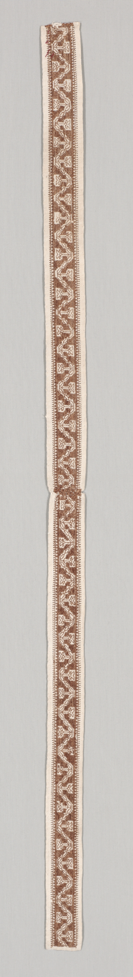 Embroidered Band by Lenka. Long, narrow, off-white fabric strip with brown embroidery. The embroidery features a repeating pattern of brown and light brown geometric shapes resembling zigzags or chevrons. The fabric has a straight edge on both sides. The background of the image is light gray. The fabric appears to be made of two parts joined in the middle.