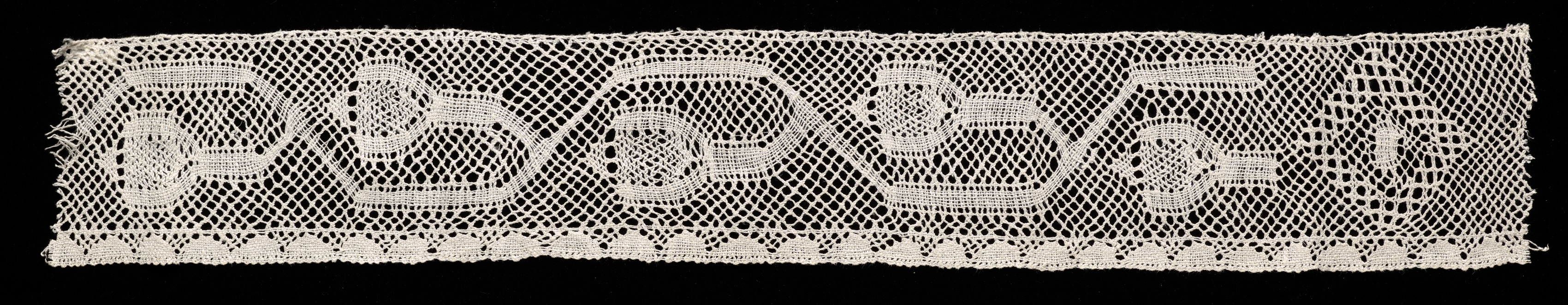 The image shows a white bobbin lace band on a black background. The band is long and narrow, with a repeating pattern of eight identical shapes. The pattern includes a rounded figure with a tail-like element extending to the right from the bottom, a curved line above with a circular element on the left and an elongated element on the right. A grid of small hexagons fills the background. The band has a scalloped edge at the bottom, with small triangular points.