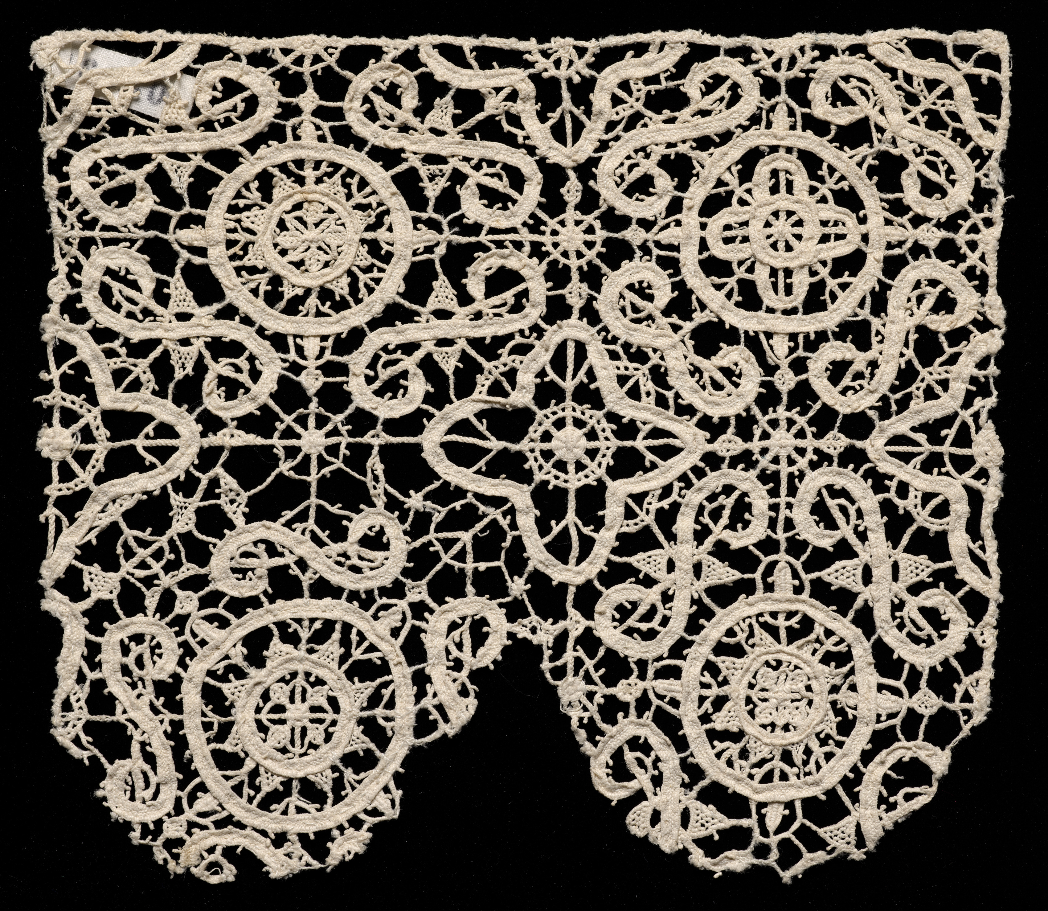 Square-shaped bobbin lace fragment, "Bobbin Lace (Mezzo Punto) Fragment" by unknown artist. The lace is off-white or cream-colored. The lace features intricate floral and scrollwork designs. There are circular motifs with floral patterns in the center and scrolling lines that connect them. The lace has a dense, woven appearance with a textured surface. The edges are rough and uneven, suggesting it was cut or broken off from a larger piece. The background of the image is solid black. The lace appears to be made of a delicate, possibly linen or cotton, thread. The overall design is symmetrical, with a repeating pattern of floral and scrollwork motifs.