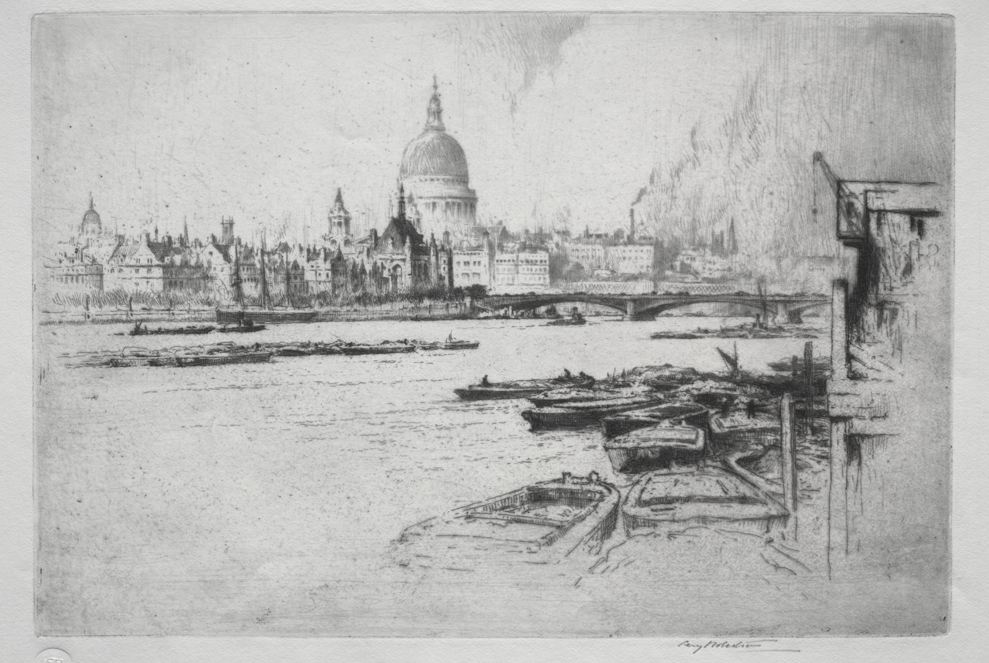 Black and white image of a cityscape. River Thames with boats on it. Large domed building in the background. A bridge spans across the river. A city skyline with many buildings. The artwork is titled "St. Paul's" by Percy Robertson.