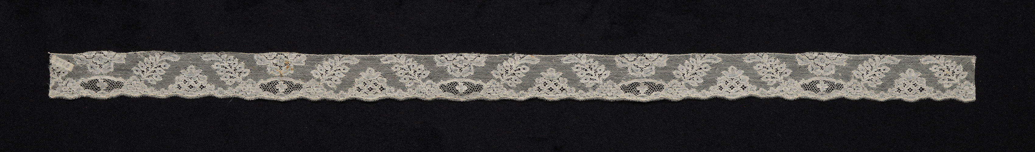 Bobbin Lace Edging by an unknown artist. A long, narrow strip of white bobbin lace with a repeating floral pattern against a black background. The lace has a wavy edge along the bottom. The floral patterns are symmetrical, with pairs of flowers on either side of a central diamond shape. The flowers are made up of several rounded petal-like shapes. The lace is made up of intricate white threads. The background is solid black. The lace strip runs horizontally across the center of the image.