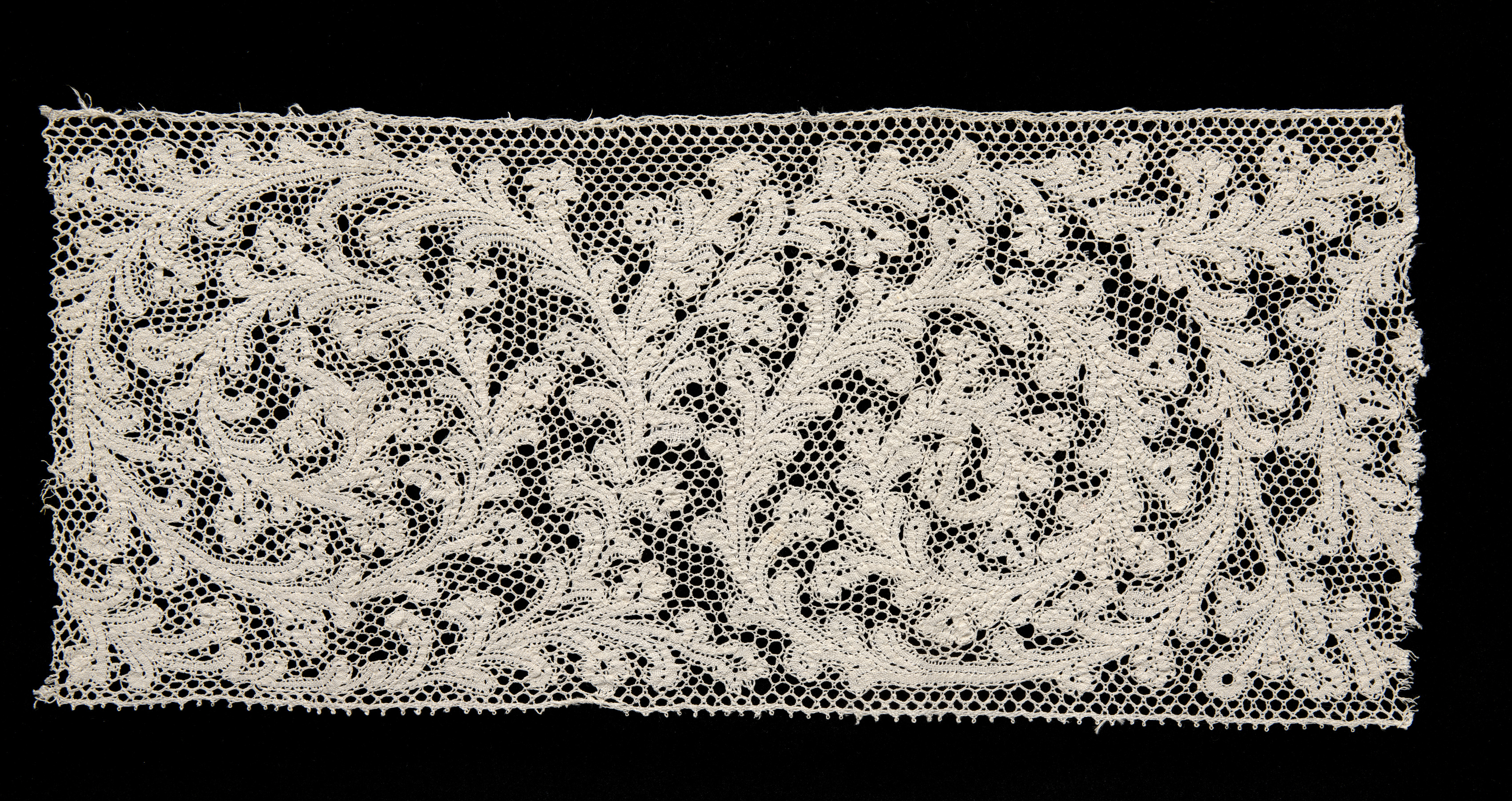 White rectangular lace with intricate floral pattern on a black background, "Bobbin Lace (Punto di Milano) Band".