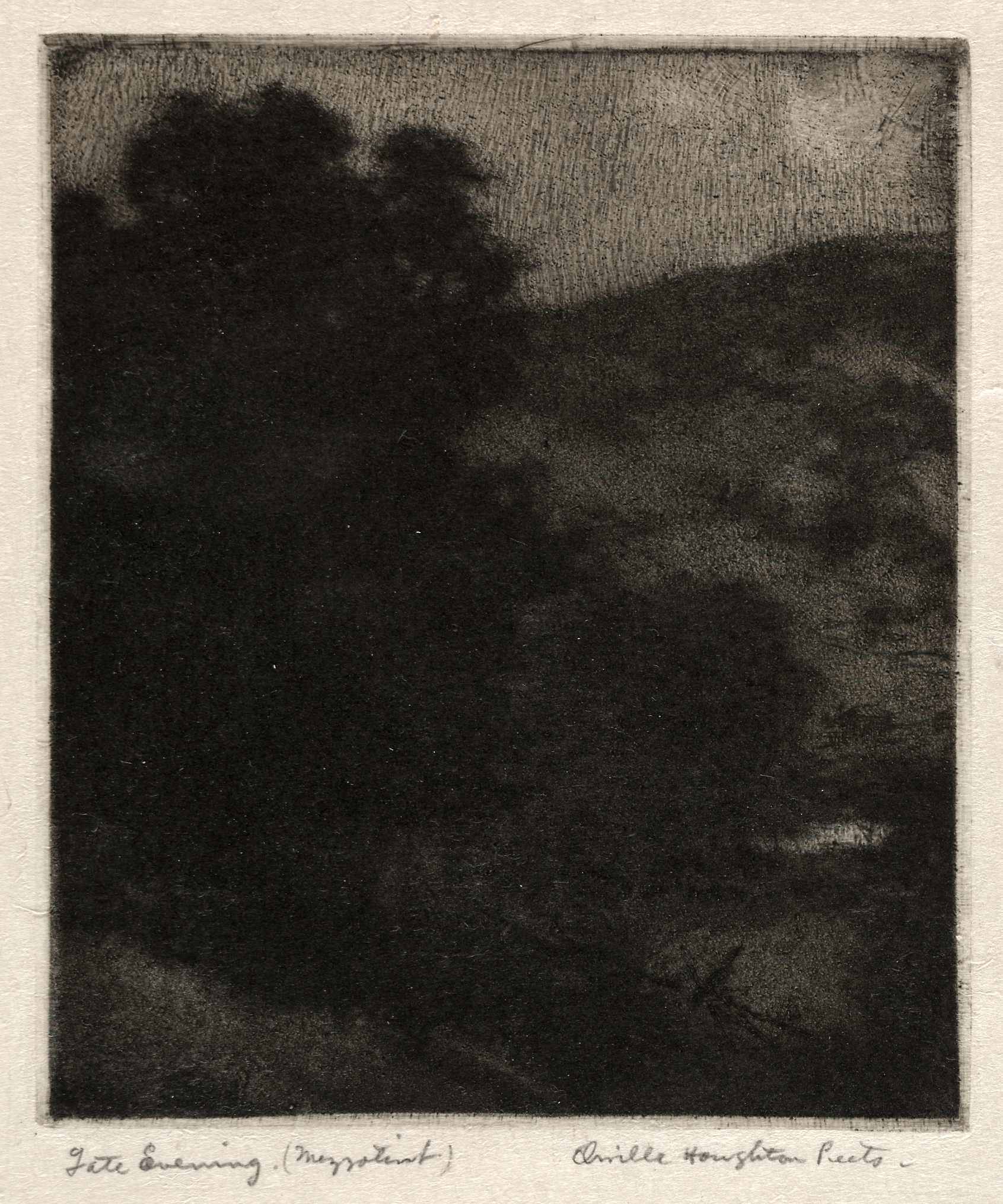 Black and white artwork, rectangular with a beige border. A dark landscape with a large tree on the left side. The tree and surrounding ground are very dark. The background shows a lighter hill or mountain. A lighter sky is at the top. The artwork has a signature at the bottom. The text reads "Late Evening (Mezzotint)" on the left and "Orville Houghton Peets" on the right.