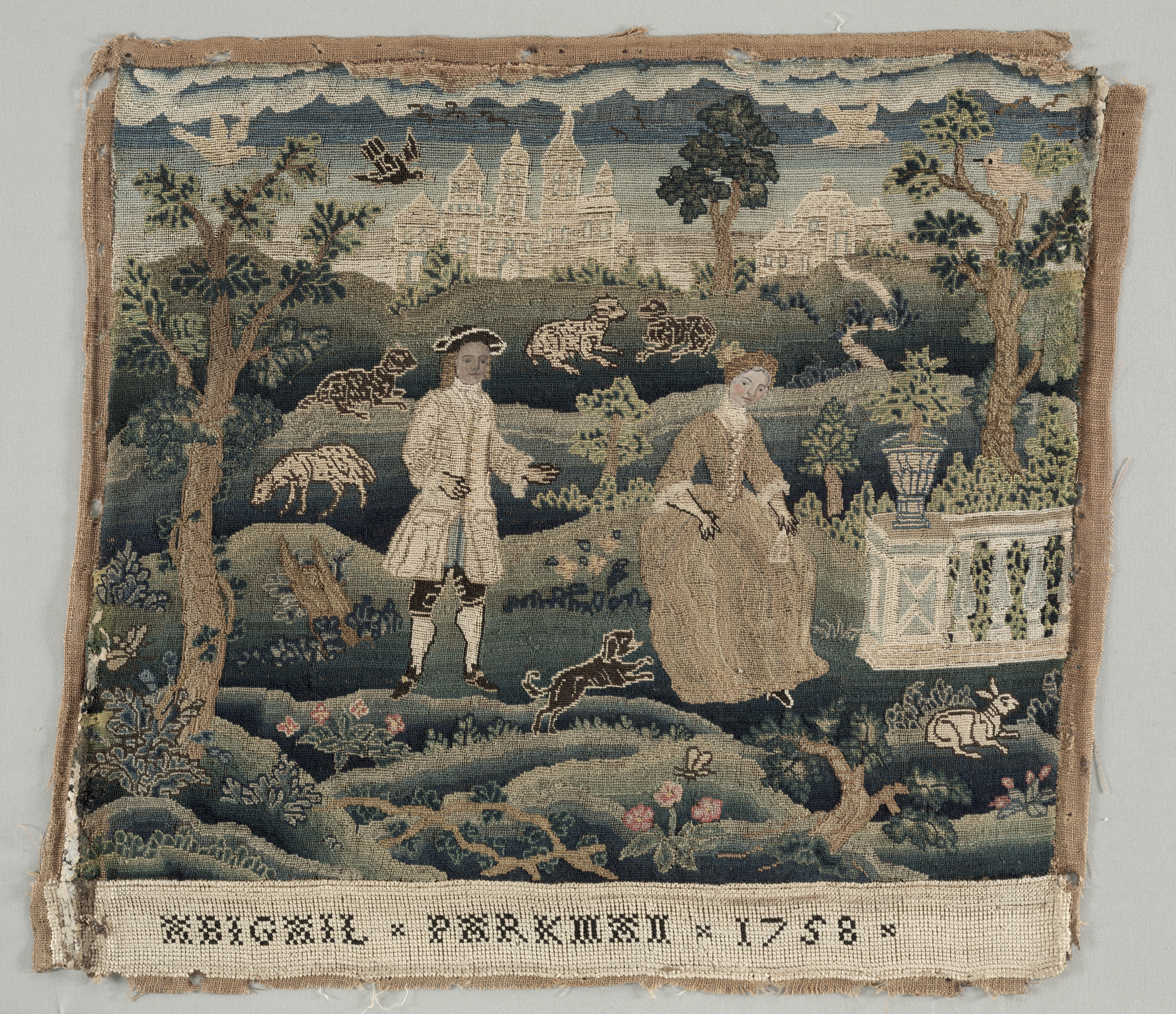 Square, old-fashioned embroidery with frayed edges. The scene depicts a man and woman in 18th-century clothing standing in a garden. The man on the left wears a white outfit with a hat and holds a stick or cane; the woman on the right wears a long brown dress. They are surrounded by trees, bushes, and animals including sheep and a dog. In the background, a distant cityscape and mountains are visible under a cloudy sky. A decorative border at the bottom reads "ABIGAIL PARKMAN 1758".