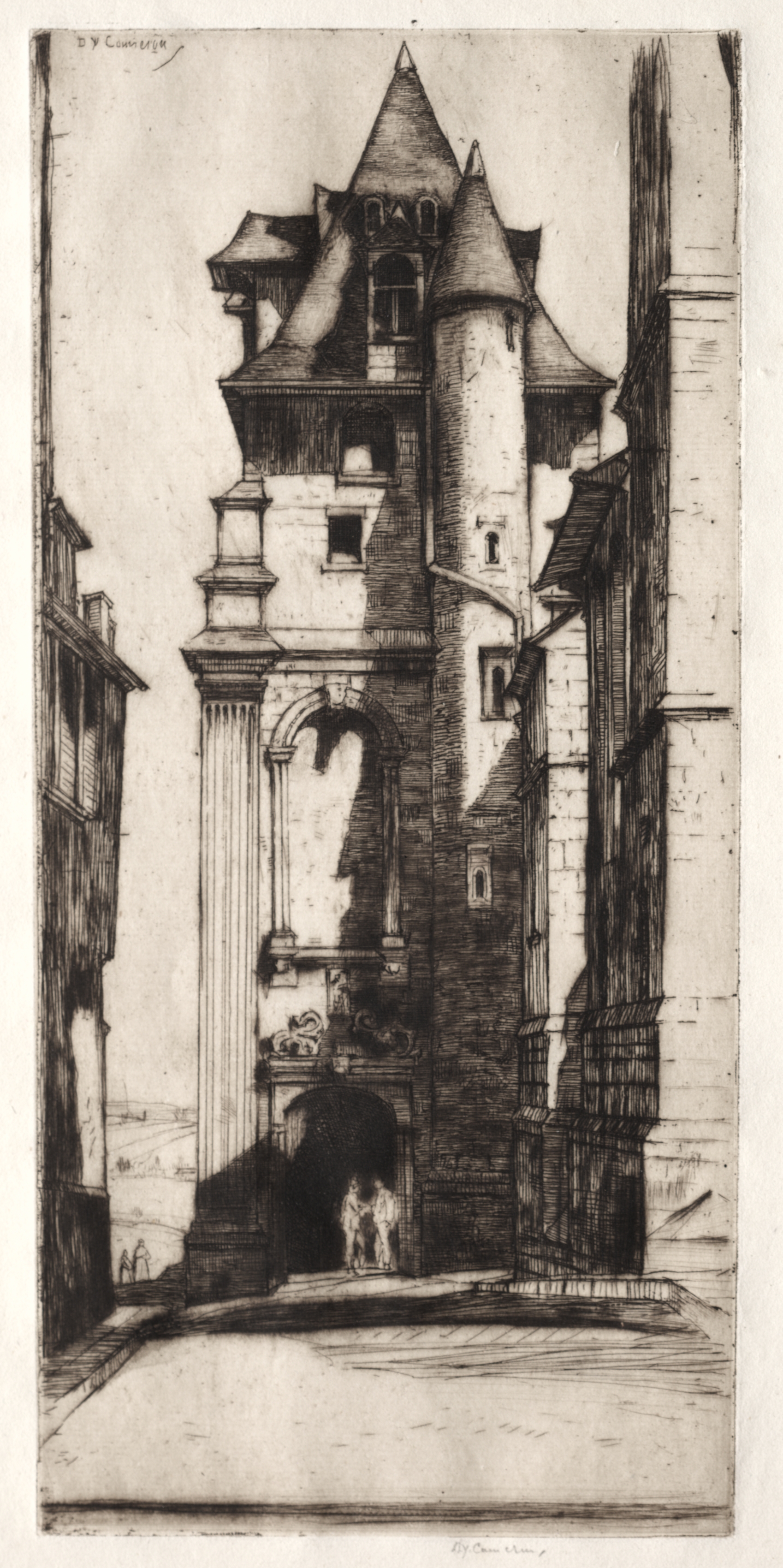 Black and white image of a stone building with a large archway, a tower and conical roofs. The building is in the center with buildings on either side. Two people stand in the archway. The image is a drawing or etching.