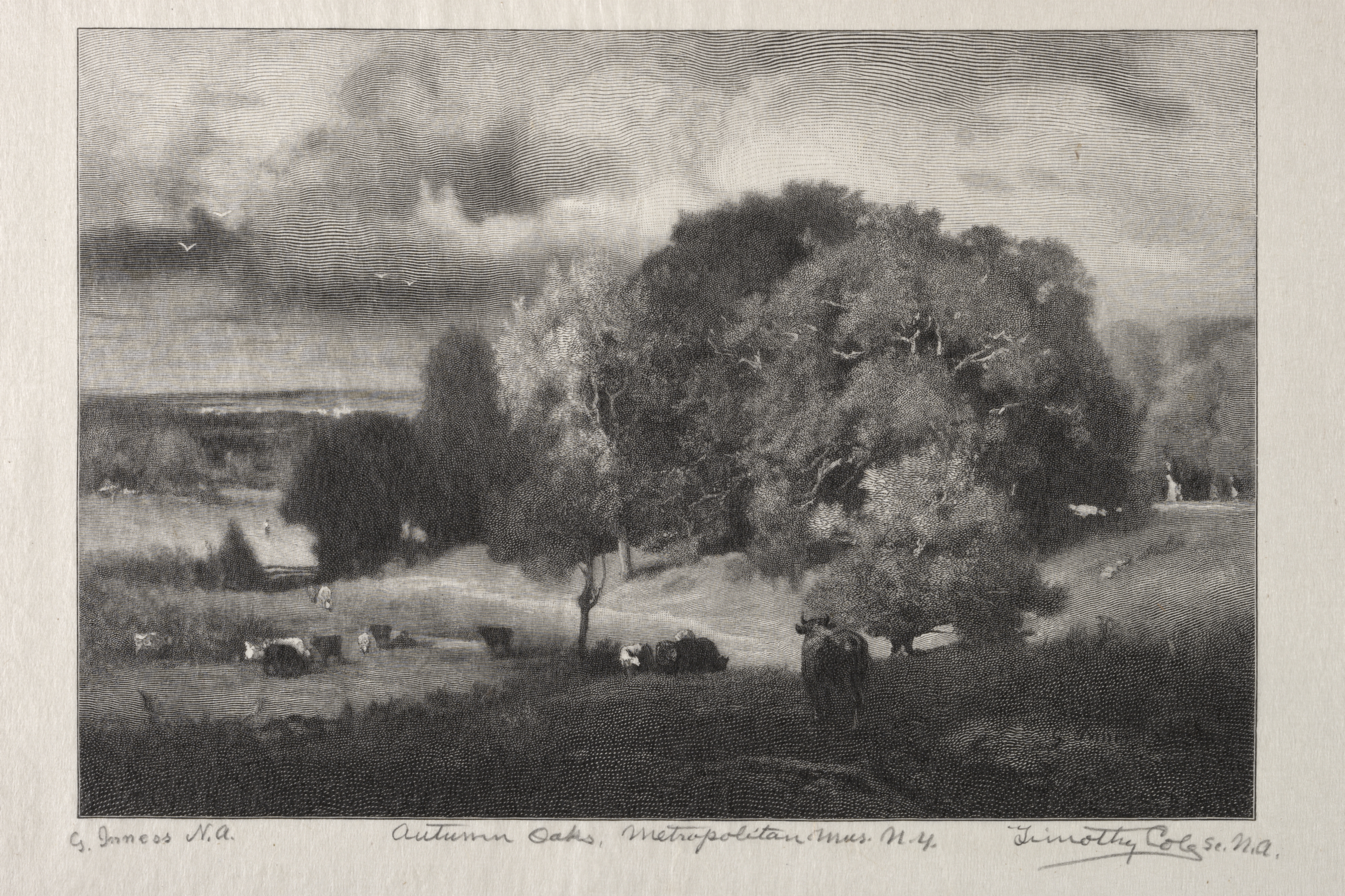 Black and white landscape image. A dark area of trees in center-right. A herd of cows near trees and a few trees sparsely scattered in background on horizon line. Sky is cloudy. A bird flying near top-left. Border surrounds image. Lower border contains cursive text identifying image as "Autumn Oaks" by Timothy Cole.