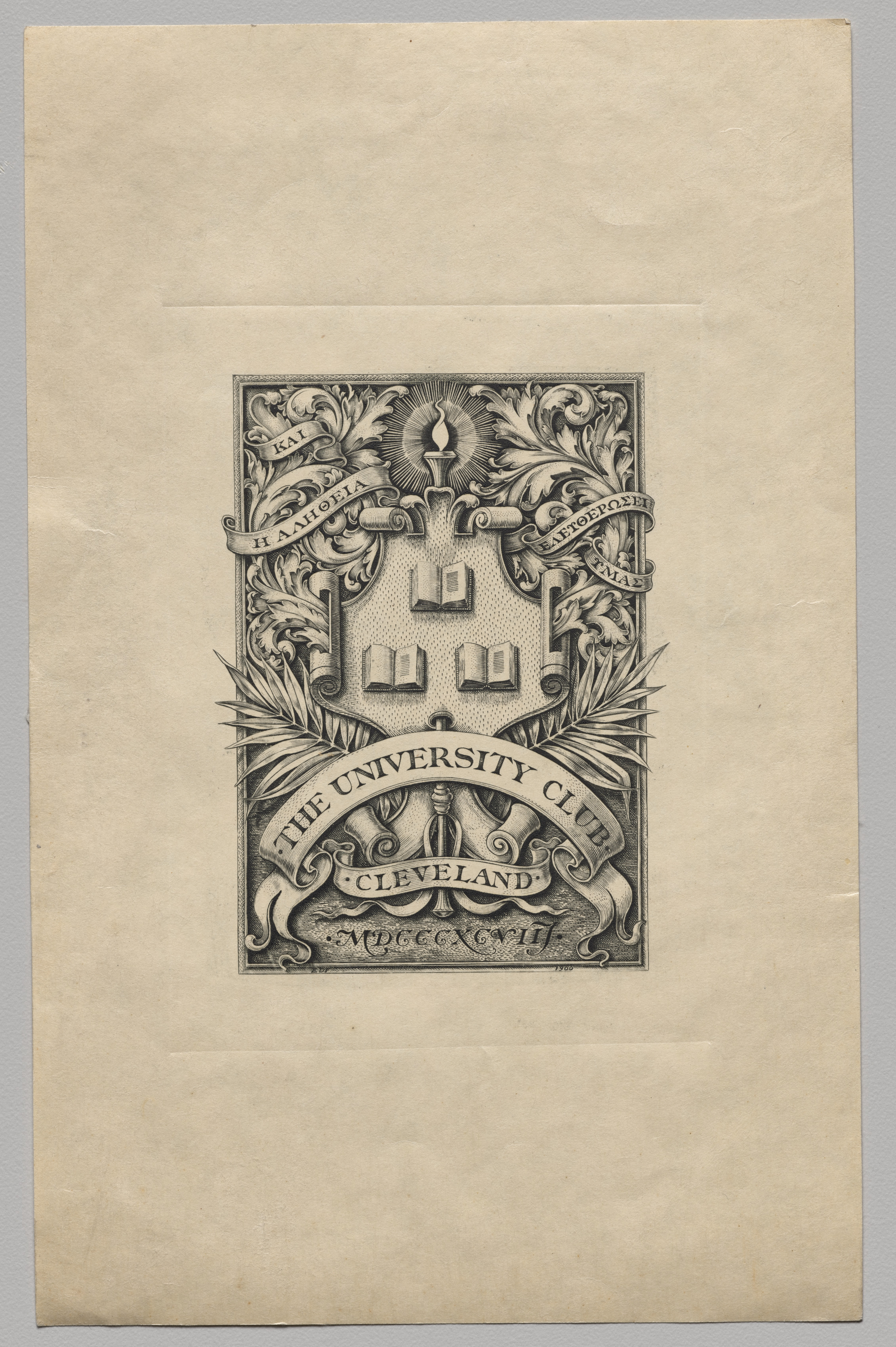 Bookplate for The University Club, Cleveland. Black and white illustration on aged paper. Rectangular design with intricate border of leaves and scrolls. Shield shape in center with torch at top, three books below. Two banners on either side of shield with indecipherable text. Banner below shield reads "The University Club Cleveland". Gray background.