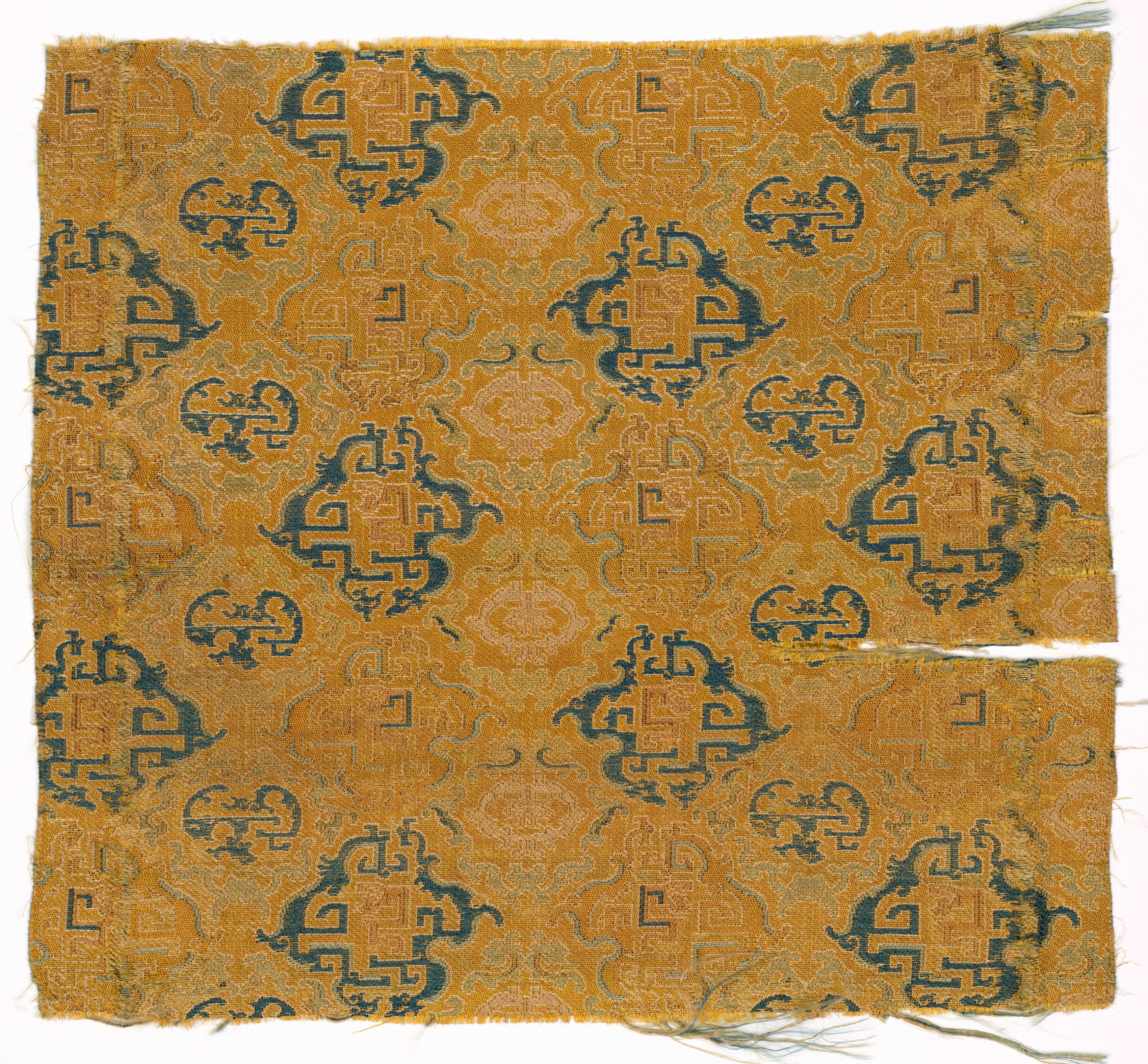 The title is "Fragment" by an unknown artist. The image shows a square piece of fabric with frayed edges. The fabric is yellow-orange with a repeating pattern of dark blue and light blue designs. The dark blue designs are symmetrical and resemble flowers or other organic shapes. The light blue designs are intricate and swirling, and they fill in the spaces between the dark blue shapes. The fabric appears to be old and worn, with some threads loose or missing. There is a tear in the fabric on the right side, near the bottom. The background behind the fabric is white.
