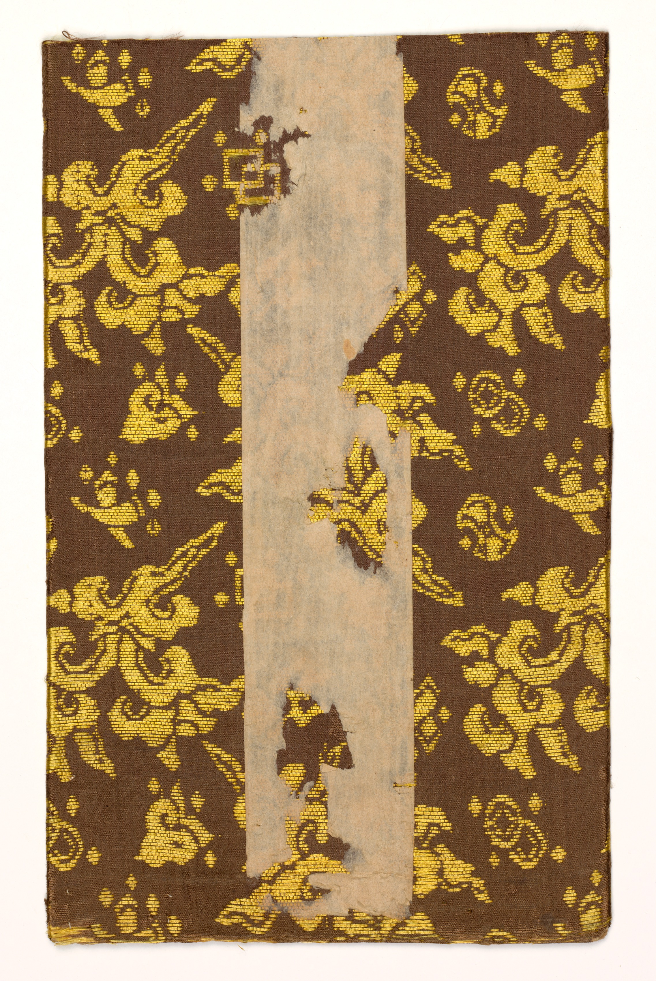 Brown fabric with yellow floral pattern, rectangular shape, rough edges, vertical strip of off-white material down center, strip appears to be peeling off, exposing brown fabric underneath, three holes in strip, background is white. Textile Book Cover by Robert Rauschenberg.