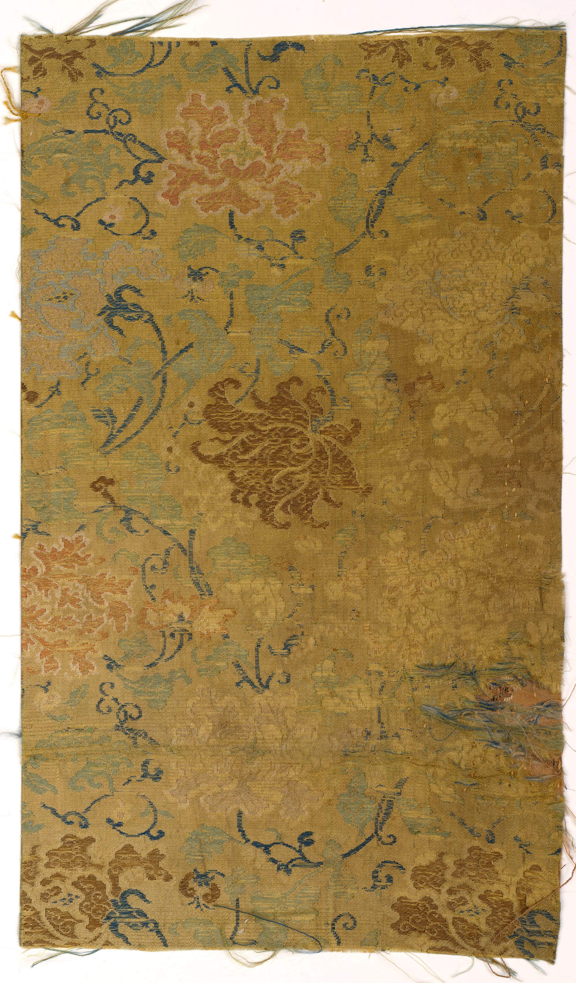 Golden yellow fabric with floral pattern in shades of brown, blue and orange; frayed edges. The title of the artwork is "Fragment" by an unknown artist.