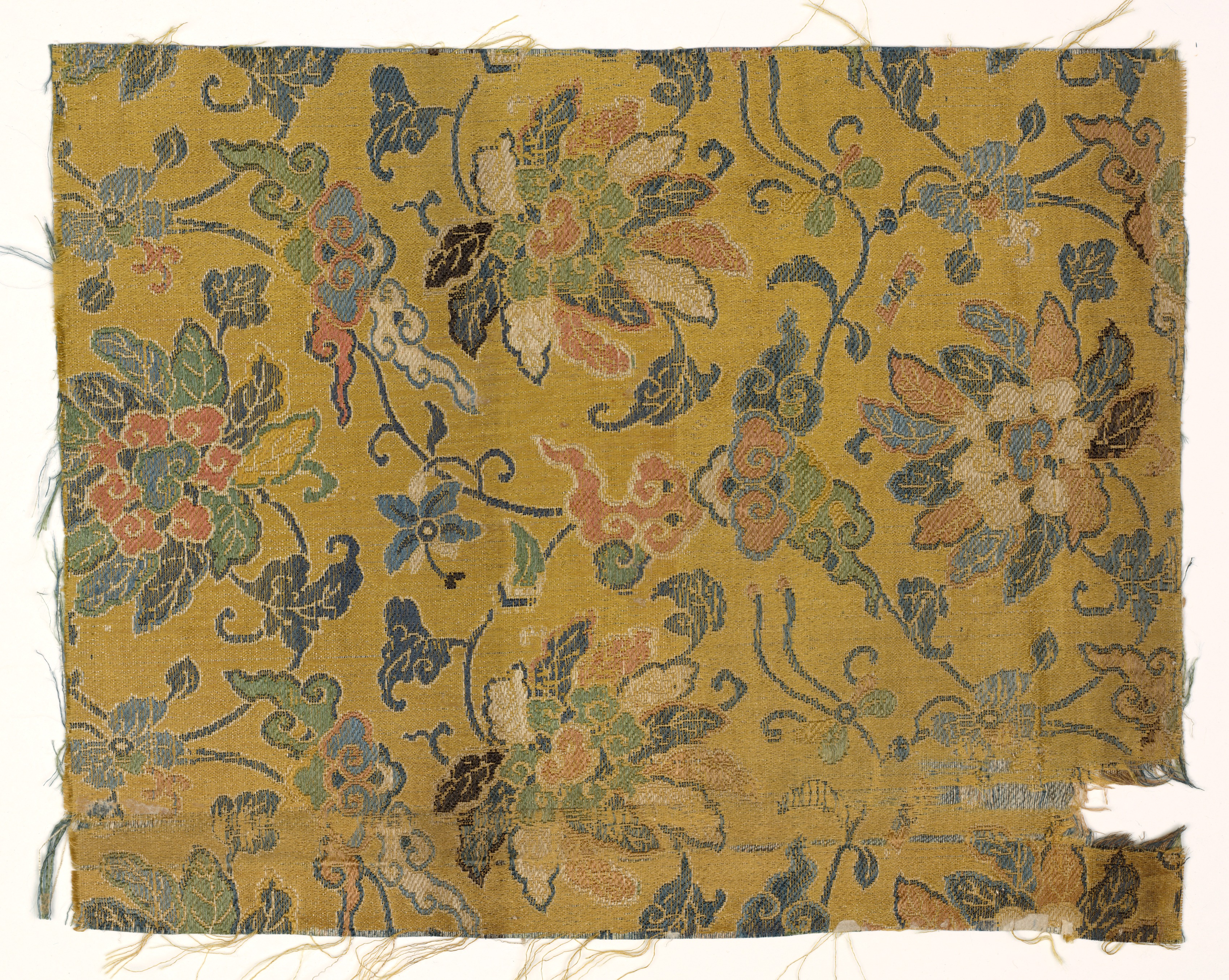 Yellow fabric with a floral pattern. The fabric is rectangular and has a yellow background. The floral pattern consists of blue, green, orange, and white flowers and leaves. The fabric appears to be torn and frayed around the edges. The floral pattern is intricate and features various shapes and designs. The fabric is titled "Fragment" and attributed to an unknown artist.