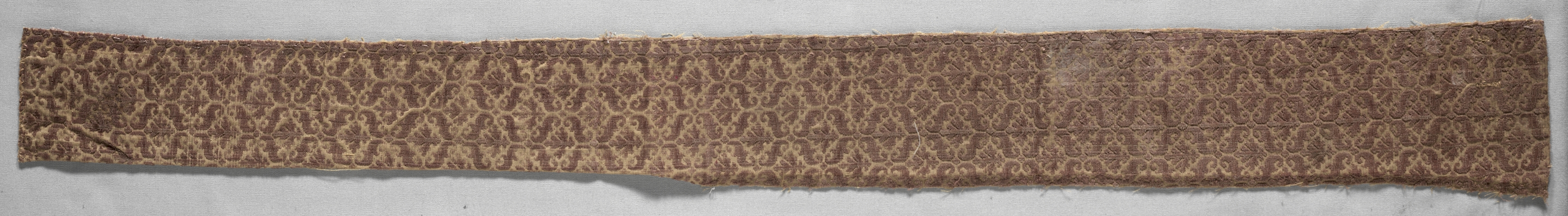 The image shows a long, narrow piece of fabric titled "Velvet Band" by an unknown artist. The fabric is brown with a tan floral pattern. The fabric is rectangular and oriented horizontally. The top and bottom edges of the fabric are rough and frayed. The fabric has a slight sheen and appears to be made of velvet. The background behind the fabric is light gray. The fabric is laid flat on the surface, with some areas slightly wrinkled or creased. The floral pattern on the fabric consists of interconnected flowers and leaves. The flowers have five petals and are arranged in a repeating design. The fabric fills most of the image, with a small border around it.