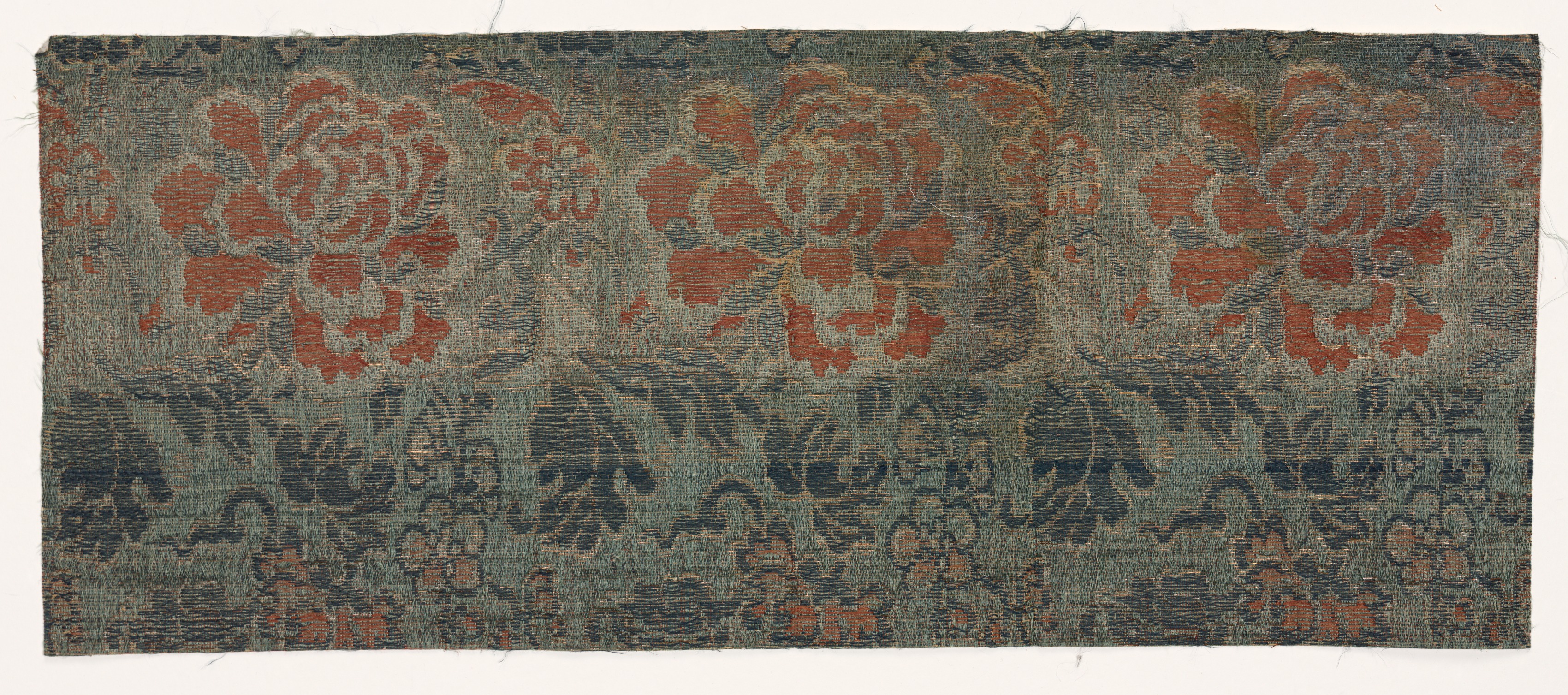 Rectangular textile with floral pattern. The textile is long and narrow, oriented horizontally. The background is muted greenish-gray color. The top half features a repeating pattern of large red flowers with gray outlines. The flowers appear in a row of three, with parts of two more on either side cut off. The bottom half has a darker, more muted pattern of blue and orange shapes. The textile appears old and worn, with frayed edges and faded colors. The background behind the textile is plain white. The title of the piece is "Textile Fragment".