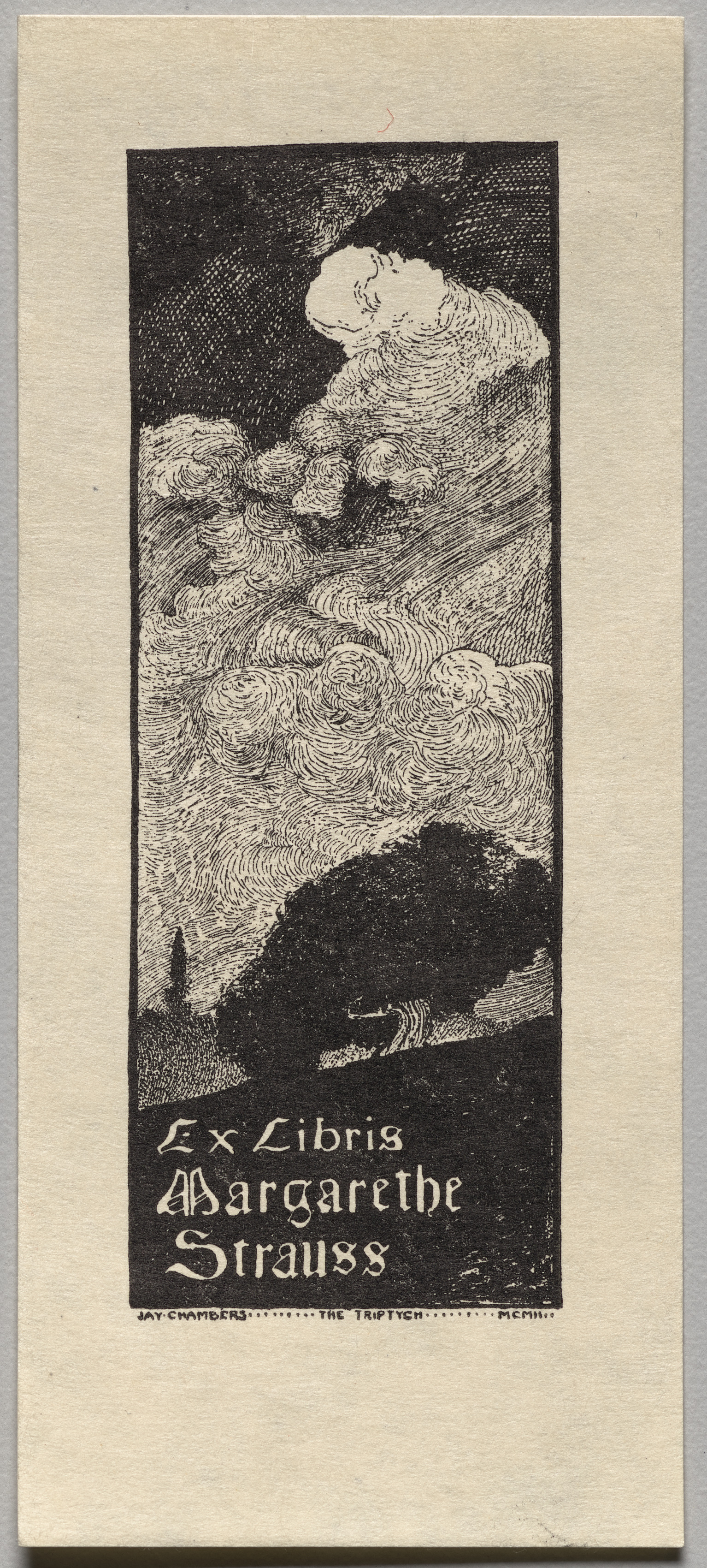 Black and white drawing on rectangular beige paper with rough edges. The drawing depicts a cloudy scene with a full moon. The lower third shows a flat landscape with a church steeple on the left and tree on the right. The bottom half of the drawing fades into a solid black rectangle. The rectangle contains cream-colored text reading "Ex Libris Margarethe Strauss". There is smaller illegible text along the bottom edge of the rectangle.