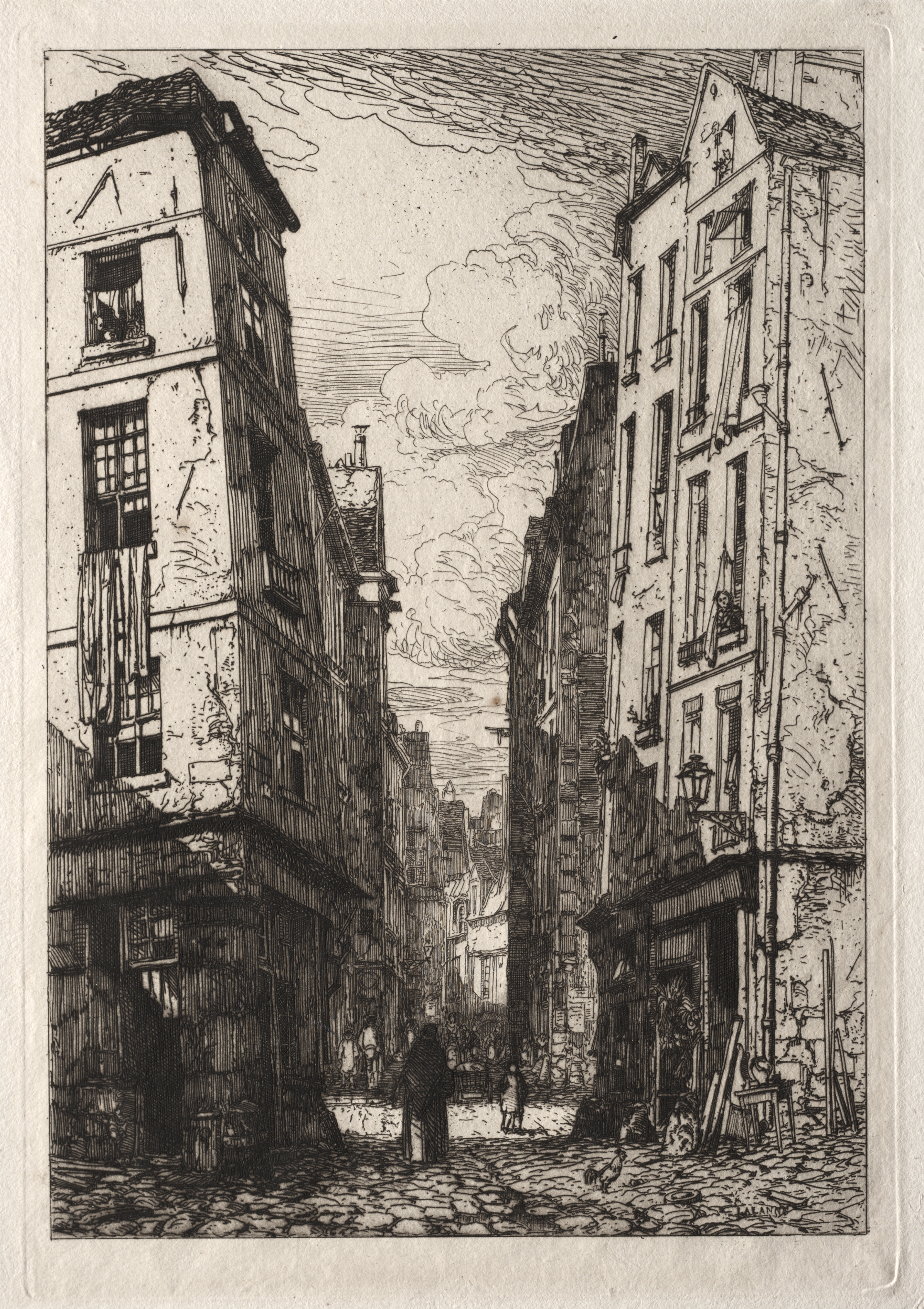 Black and white etching of a street scene. Two tall buildings on either side of a cobblestone street. Buildings are old, with uneven facades and steeply pitched roofs. Windows on buildings are rectangular with multiple panes. A dark doorway on the right building, and a smaller doorway on the left. People and a dog in the street. Cloudy sky with lines suggesting wind. The image is in a rectangular format with a thin border around it.