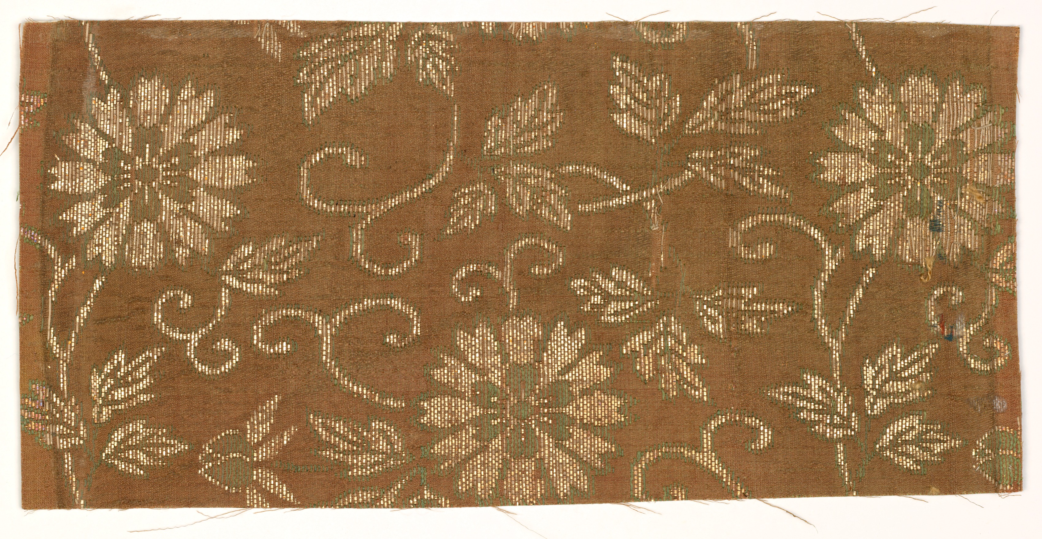 Brown textile with a floral pattern. The pattern consists of large flowers and leaves in a light beige color. The flowers have multiple petals and are connected by curved stems and vines. The leaves are teardrop-shaped and vary in size. The background of the textile is a solid brown color. The edges of the textile are rough and uneven, with some threads loose. The textile is rectangular in shape.