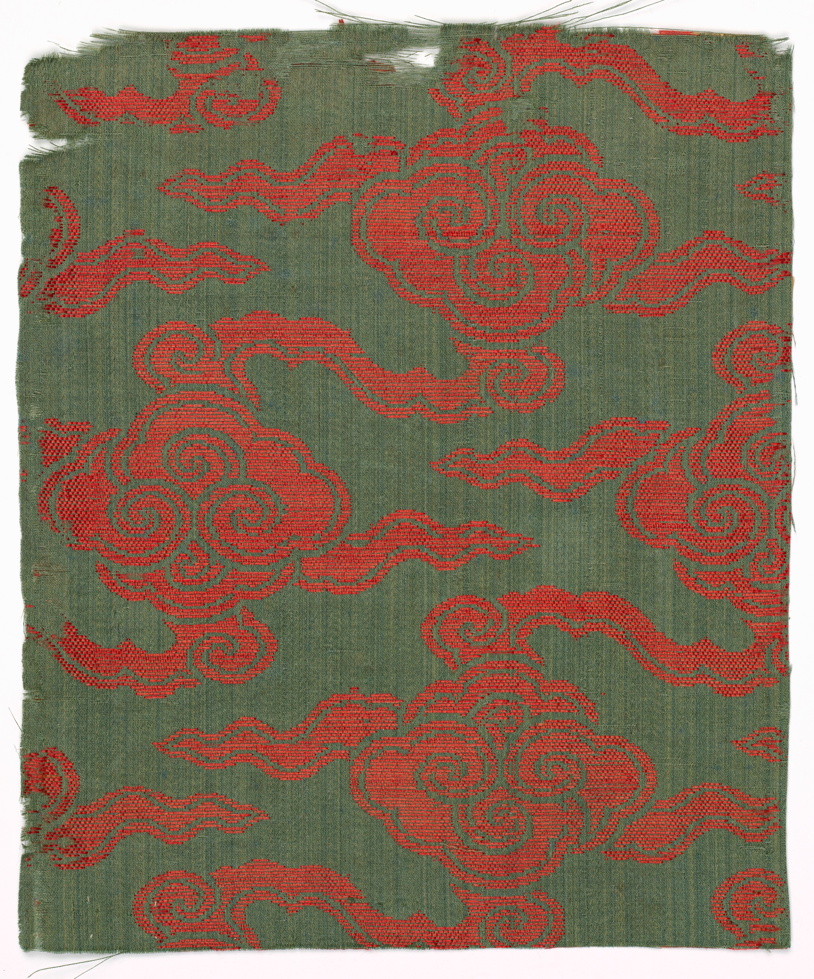 Green fabric with red designs. The fabric is rectangular and has a rough, frayed edge around all sides. The green fabric has a ribbed texture. The red designs are stylized and appear to be some sort of animal or mythical creature. They have curled tails and spiral patterns on their bodies. The designs are arranged in a repeating pattern across the fabric, with some extending off the edges. The background behind the fabric is white. Title: Fragment. Artist unknown.