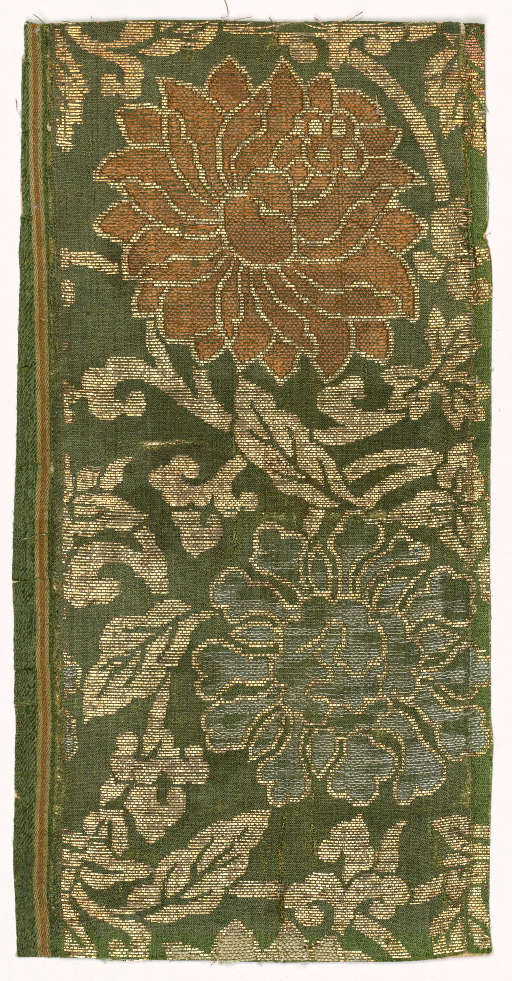 Green textile with a large brown flower at the top and a blue flower at the bottom, both outlined in gold. The background of the textile is a dark green color with gold floral patterns throughout. A thin gold and brown stripe runs along the left edge. The edges of the textile are rough and frayed. The artwork is "Textile Fragment" by an unknown artist.