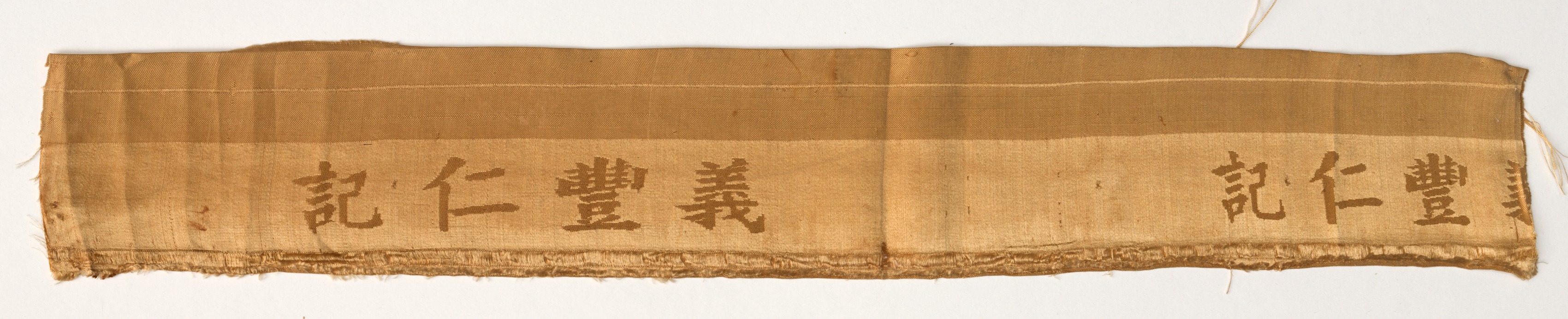 Long, narrow, frayed piece of fabric; tan with darker tan stripe running horizontally across top; frayed edges; visible stitching; Chinese characters written in darker tan on lighter tan stripe; fabric appears to be torn in middle; characters on left read "記仁豊義" and characters on right read "記仁豊". Title: Fragment Artist: unknown