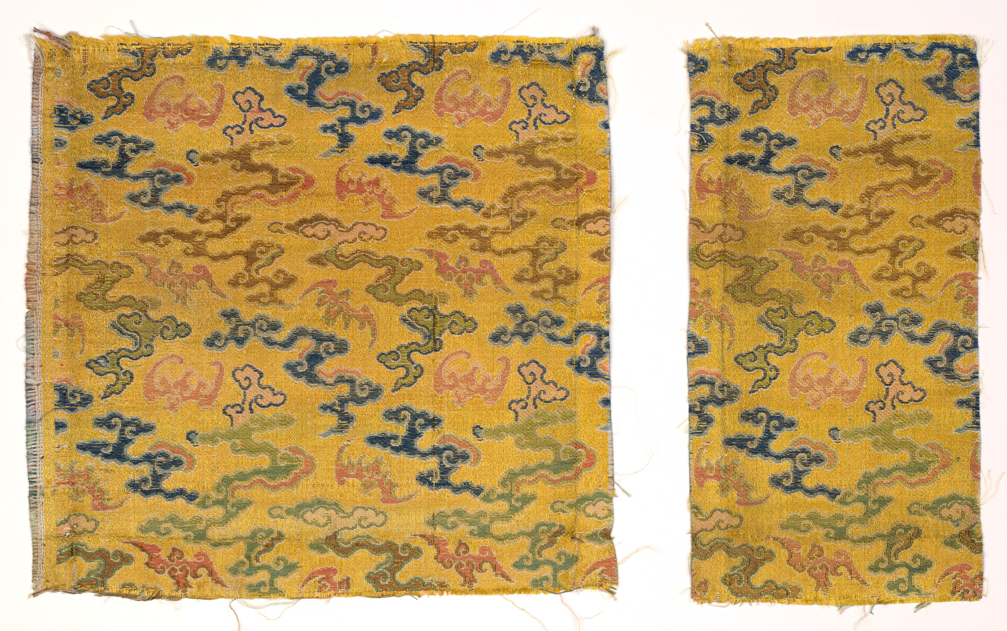 Yellow fabric with rectangular shape, frayed edges; two pieces side by side; repeating pattern of blue, green, pink and brown swirling lines. Title: Fragments Artist: Unspecified.