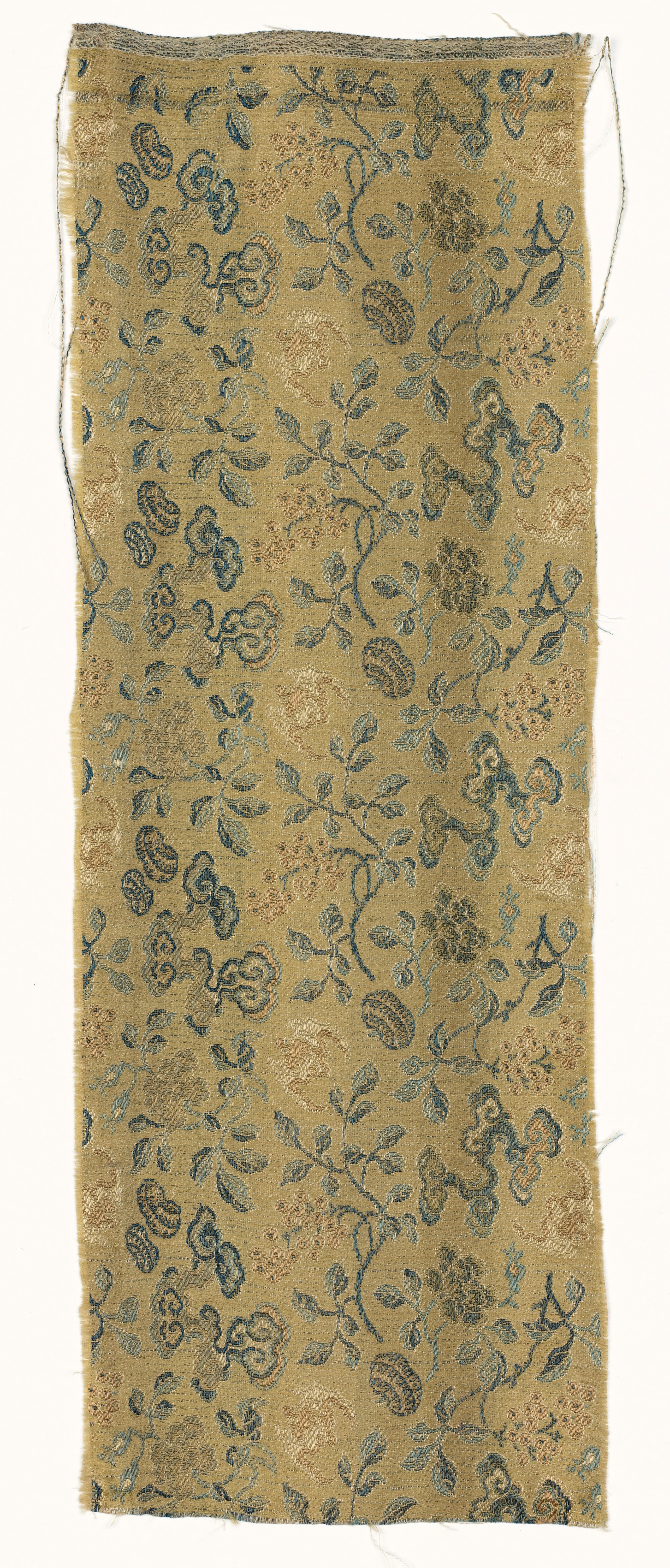 Tan-colored fabric with a floral pattern in shades of blue and brown. The fabric appears to be rectangular and has a rough, frayed edge along the top and sides. The floral design features various flowers and leaves in a repeating pattern. The fabric is titled "Fragment" and is by an unnamed artist.