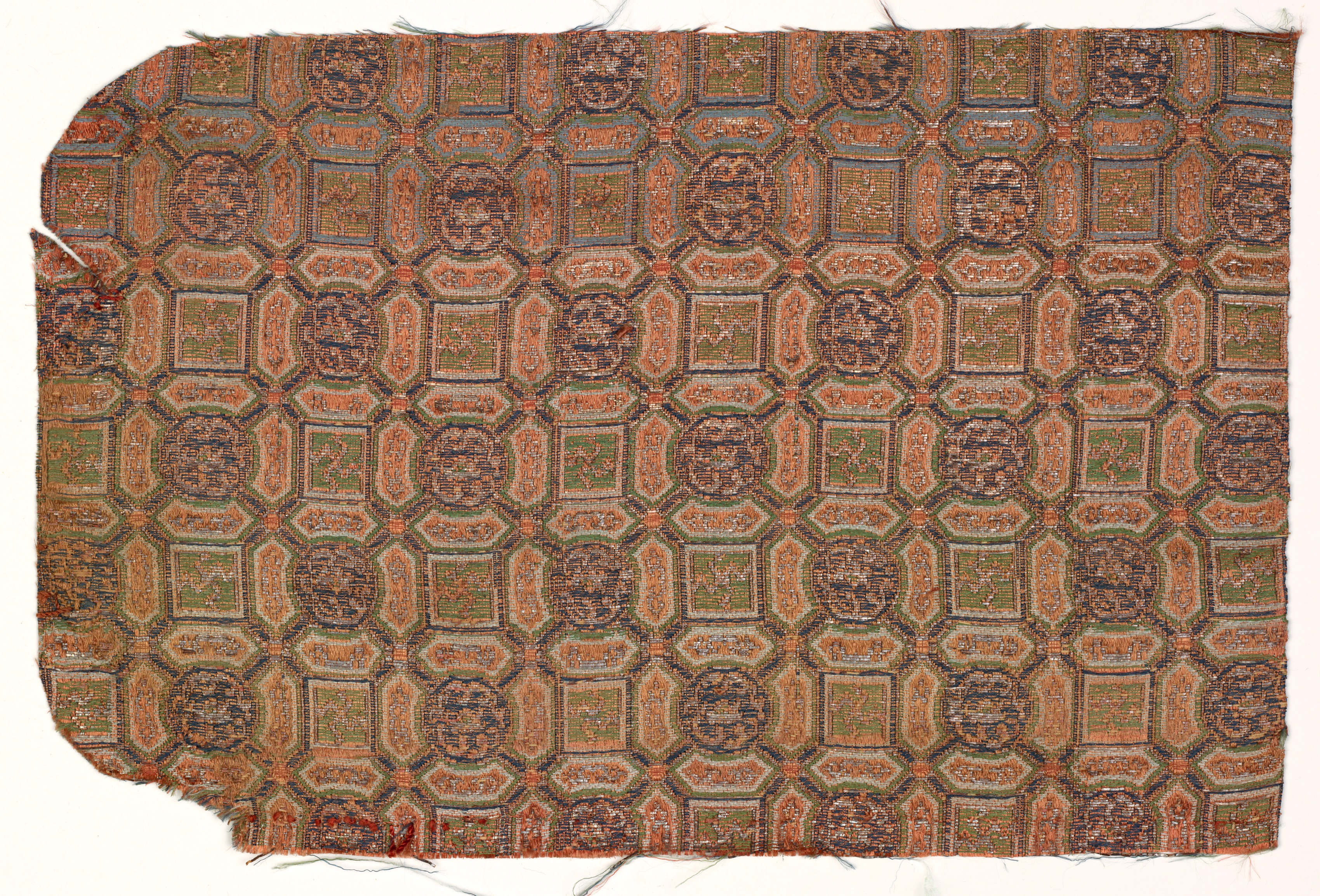 The textile fragment titled "Fragment" by the artist features a repeating geometric pattern. The pattern consists of rows and columns of various shapes, including octagons, rectangles, and squares. The shapes are outlined in black and filled with intricate designs and colors, predominantly in shades of orange, green, and brown. The fabric appears to be worn and frayed, with loose threads visible along the edges, particularly in the top and bottom sections. The background of the image is white. The overall design is symmetrical, with the shapes and patterns repeating across the fabric. The colors are muted, giving the piece an aged appearance.