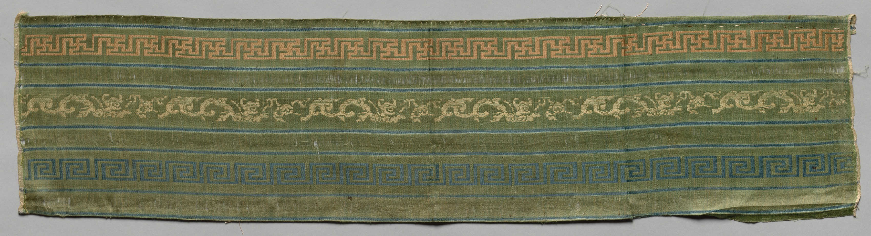 Olive green textile with horizontal stripes; three narrow blue stripes; golden yellow band with interlocking lines forming rectangles; band with golden curvilinear design; band with blue interlocking lines forming rectangles; frayed edges; on gray background. Title: Border Artist: Unspecified.