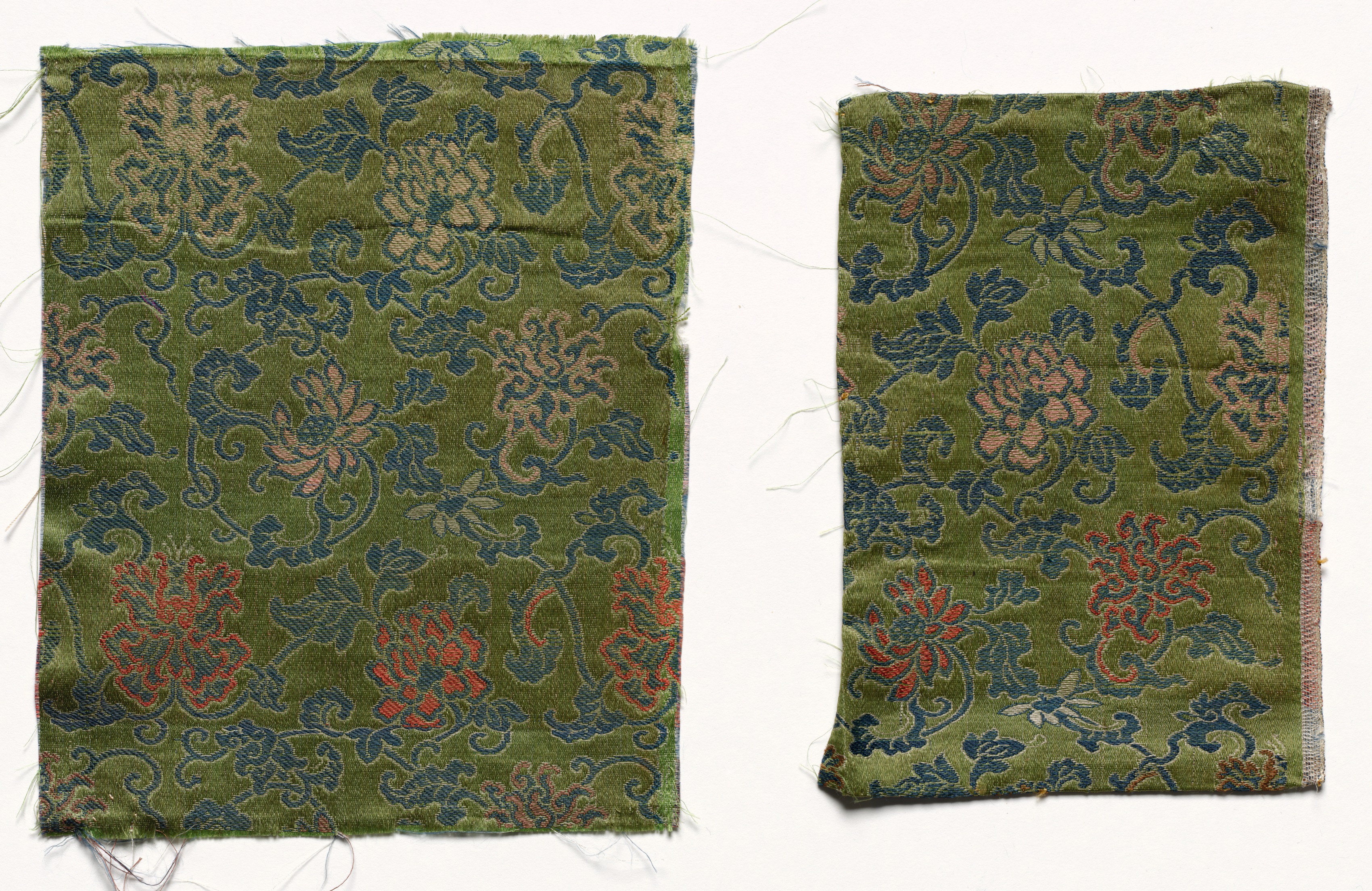 The image shows two green fabric fragments titled "Fragment" by an unidentified artist. The fabric features a repeating floral pattern with blue, red, beige and green colors. The fabric appears to be a rug or textile, with frayed edges, and there are loose threads around the edges. The background of the image is white. The fabric on the left is rectangular and larger than the fabric on the right, which is also rectangular. The fabric on the right is slightly folded. The floral pattern on both fabrics is identical. The colors in the pattern are blue, red, beige, and green.
