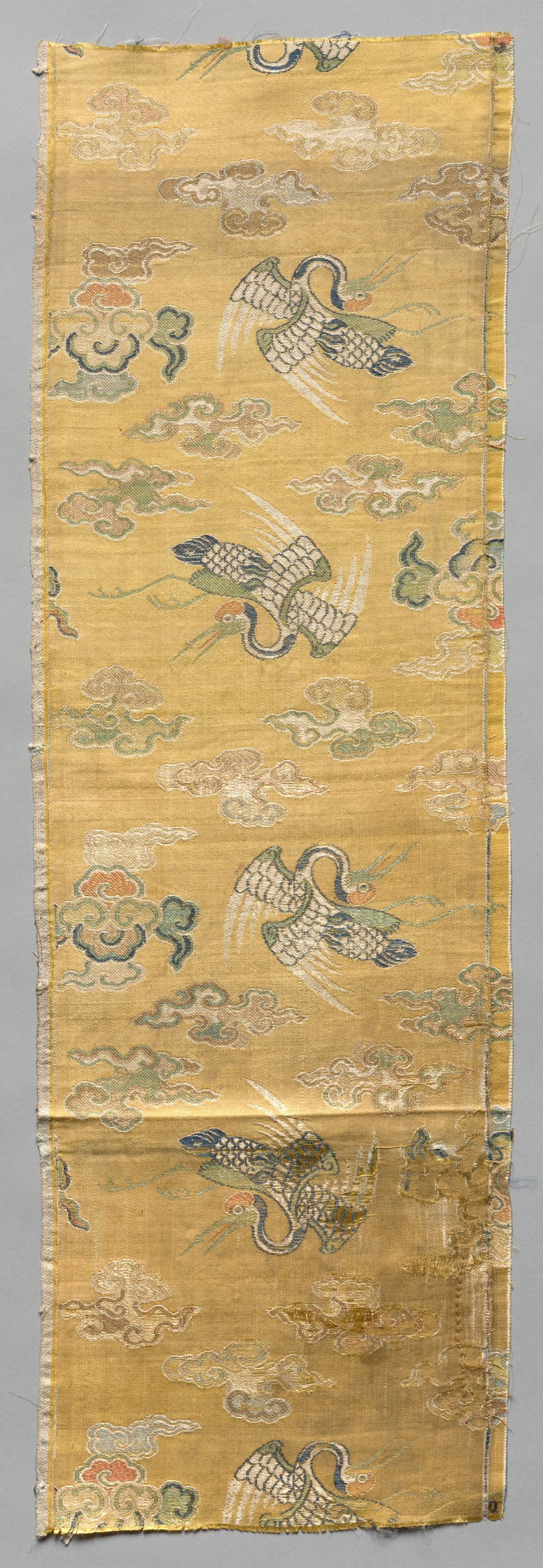 Yellow rectangular piece of fabric with frayed edges. White cranes with blue and green wings and necks and orange beaks flying amidst green and white clouds and red and green floral motifs. Fabric appears aged and worn.