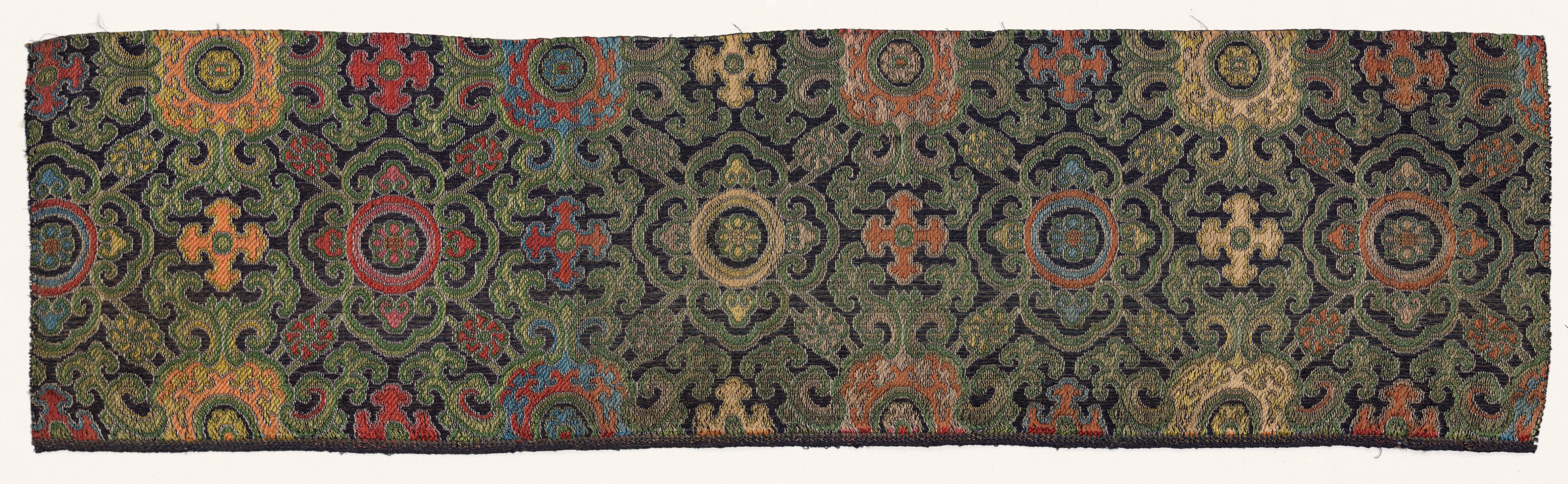 Rectangular textile with a repeating pattern of intricate designs. The background is black. The design features interconnected floral motifs in shades of green, red, orange, blue, and yellow. The motifs include circles, crosses, and curved swirling shapes. The edges of the textile are frayed. The artist and title of the piece is unknown.
