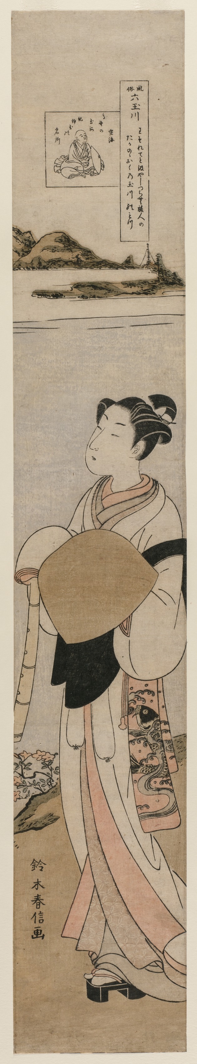 A woman with dark hair pulled up into a bun, wearing a kimono with a pink under-kimono, a black obi, and a white outer kimono with a pink lining and patterned hem. She wears geta-style sandals. The woman looks to the left and holds a large fan in her right hand and a bamboo-handled parasol in her left. In the background, a body of water with two islands, one closer to the horizon and one near the bottom; on the horizon a mountain covered with vegetation. The print has a vertical block of Japanese writing on the right side. A box in the upper part of the image contains another image of a man. The background of the print is beige.
