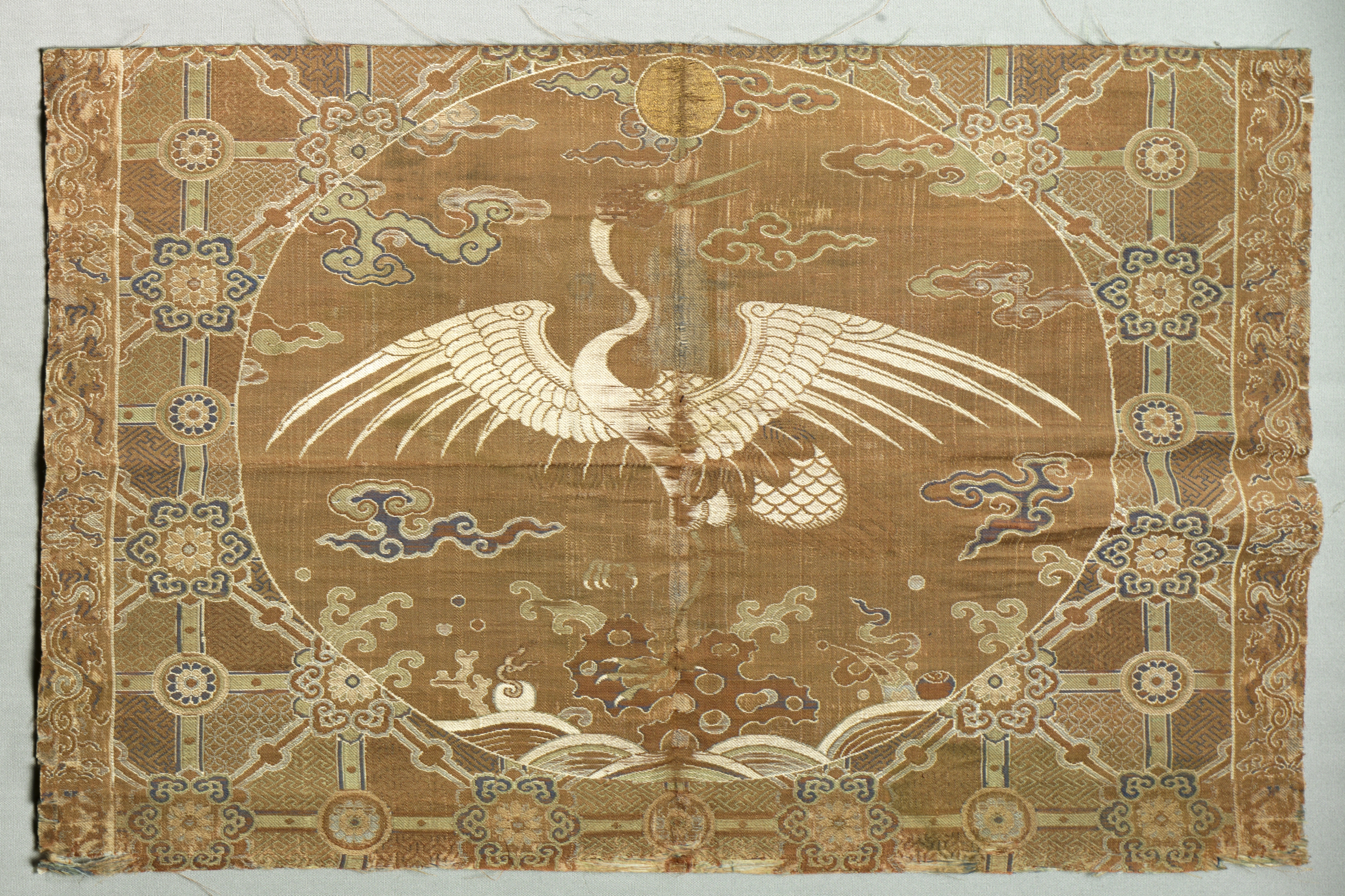Brown fabric with a white stork or crane. The fabric is rectangular with a decorative border around the edge. The border consists of interlocking geometric shapes. There are blue and gold designs throughout the border and the rest of the fabric. The stork or crane is centered on the fabric and faces to the right. The bird has its wings spread out. The background of the fabric is brown with a circular design behind the bird. The bird appears to be flying over water with waves at the bottom. There are clouds throughout the fabric.