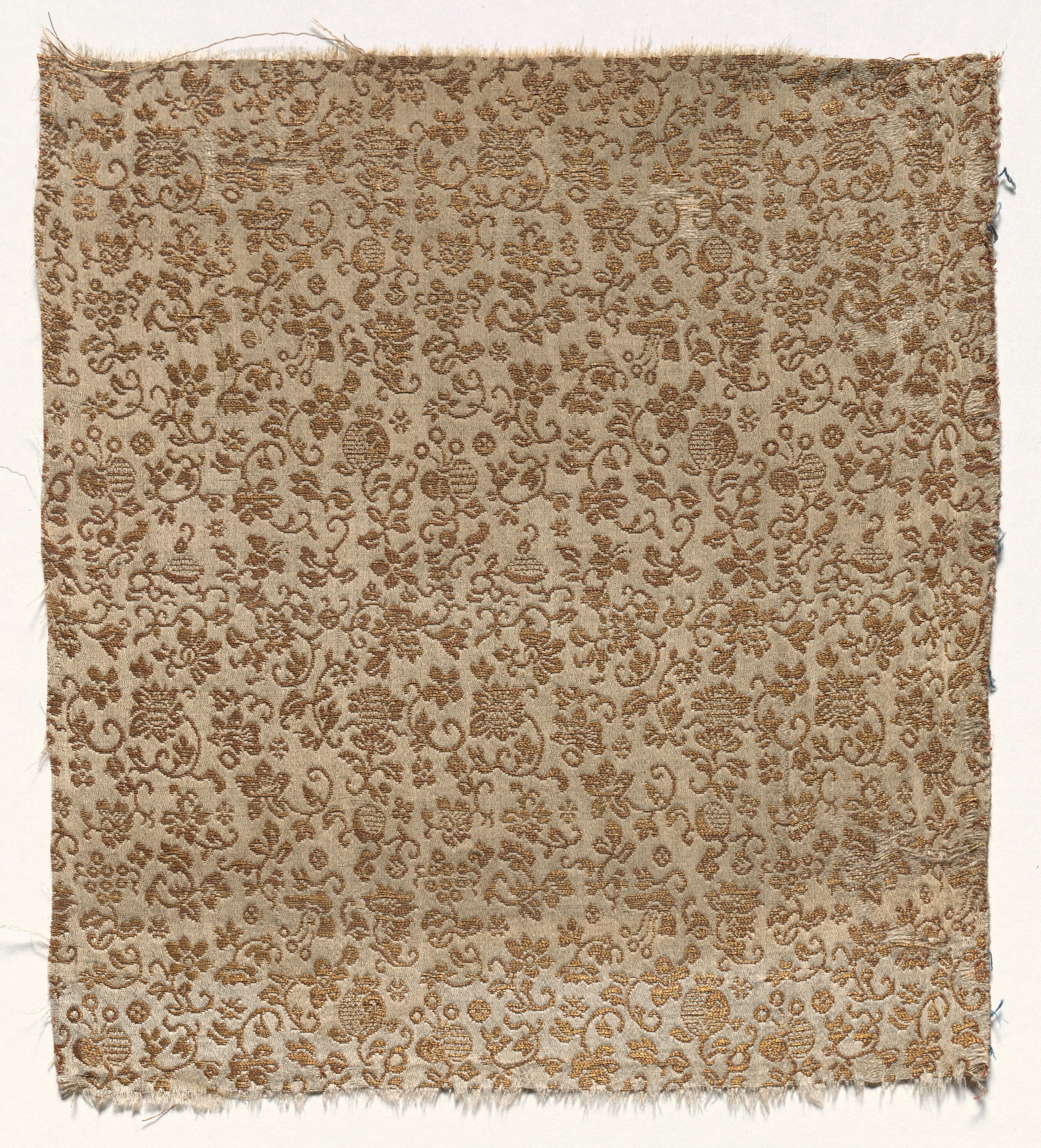 Tan-colored square textile with frayed edges and intricate brown floral pattern. The pattern features repeating designs of flowers, leaves, and curving lines. The background of the textile is a light tan color, while the floral pattern is a darker brown. The textile appears to be made of a woven material, possibly silk or cotton. Small blue threads are visible on the right side. The textile is set against a plain white background. Textile Fragment by unknown artist.