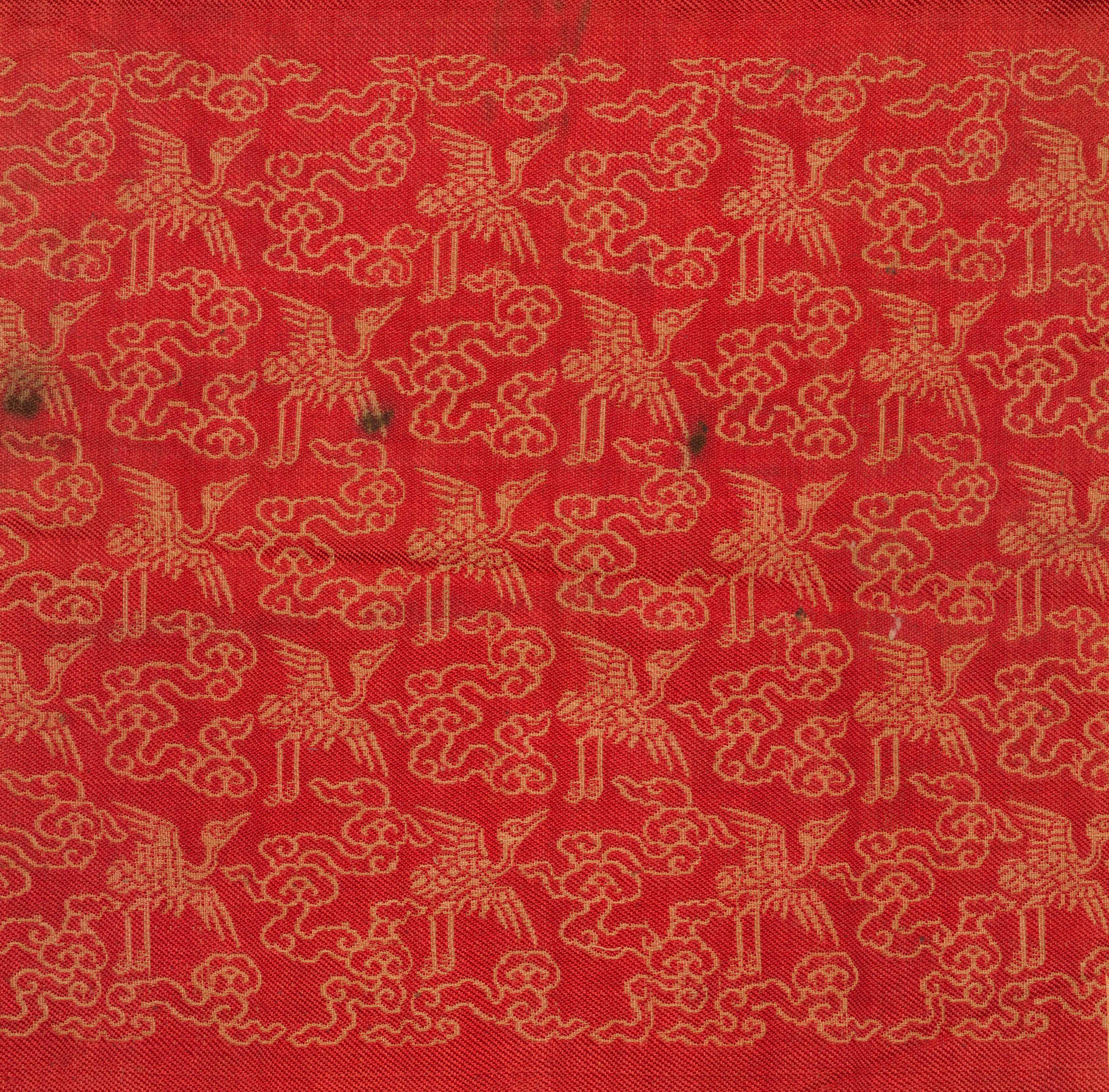 Fragment by Mark Rothko: red fabric with gold embroidered cranes and clouds. The cranes are depicted in various positions, some with their wings spread and others with their heads down. The clouds are stylized and wavy. The fabric has a textured appearance and small stains. The gold embroidery is intricate and detailed. The background of the fabric is a solid red color.
