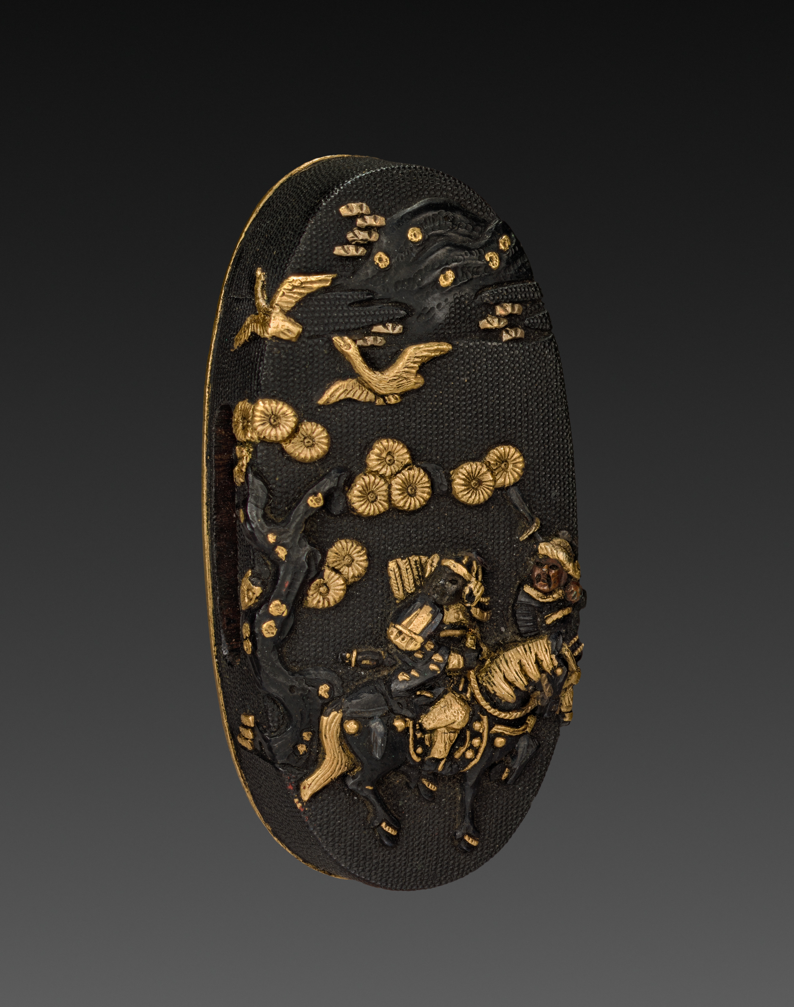 Black oval pommel with gold designs. Gold rim around edge. Gold birds. Gold chrysanthemums. Gold waves. Gold figure with armor on horse. Gold helmet on ground. Gold and black tree. Background dark gray to black gradient.