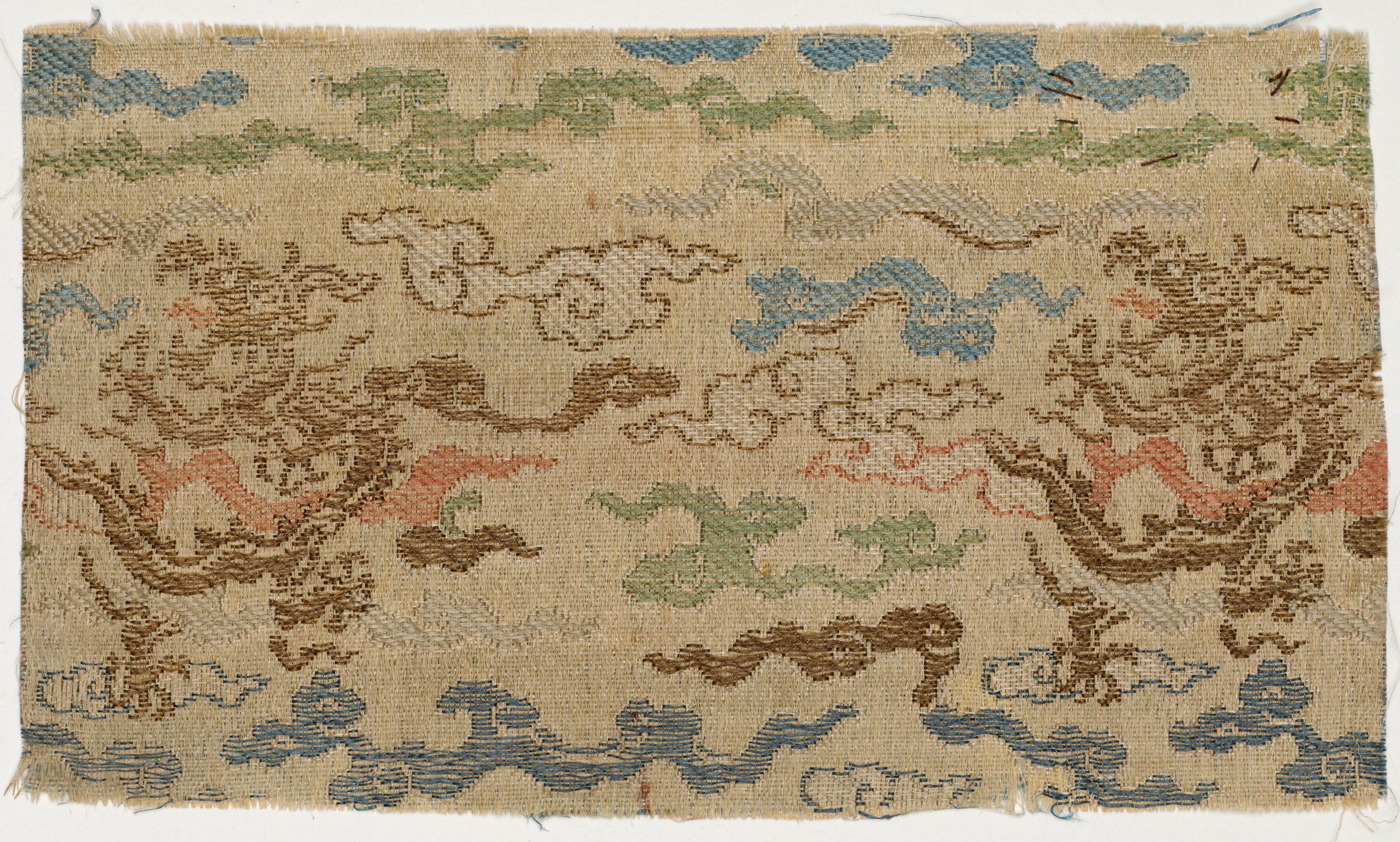 Tan-colored fabric with frayed edges. The fabric features a pattern of brown, blue, green, orange, and red designs. The design includes two symmetrical brown and orange motifs resembling dragons or other mythical creatures. The motifs have curvy lines and swirling tails. Blue and green wavy lines are scattered throughout the fabric, with more prominent blue wavy lines along the bottom edge. The background of the fabric is a light tan color. The fabric appears to be a tapestry or woven textile, titled "Fragment" by an unknown artist.