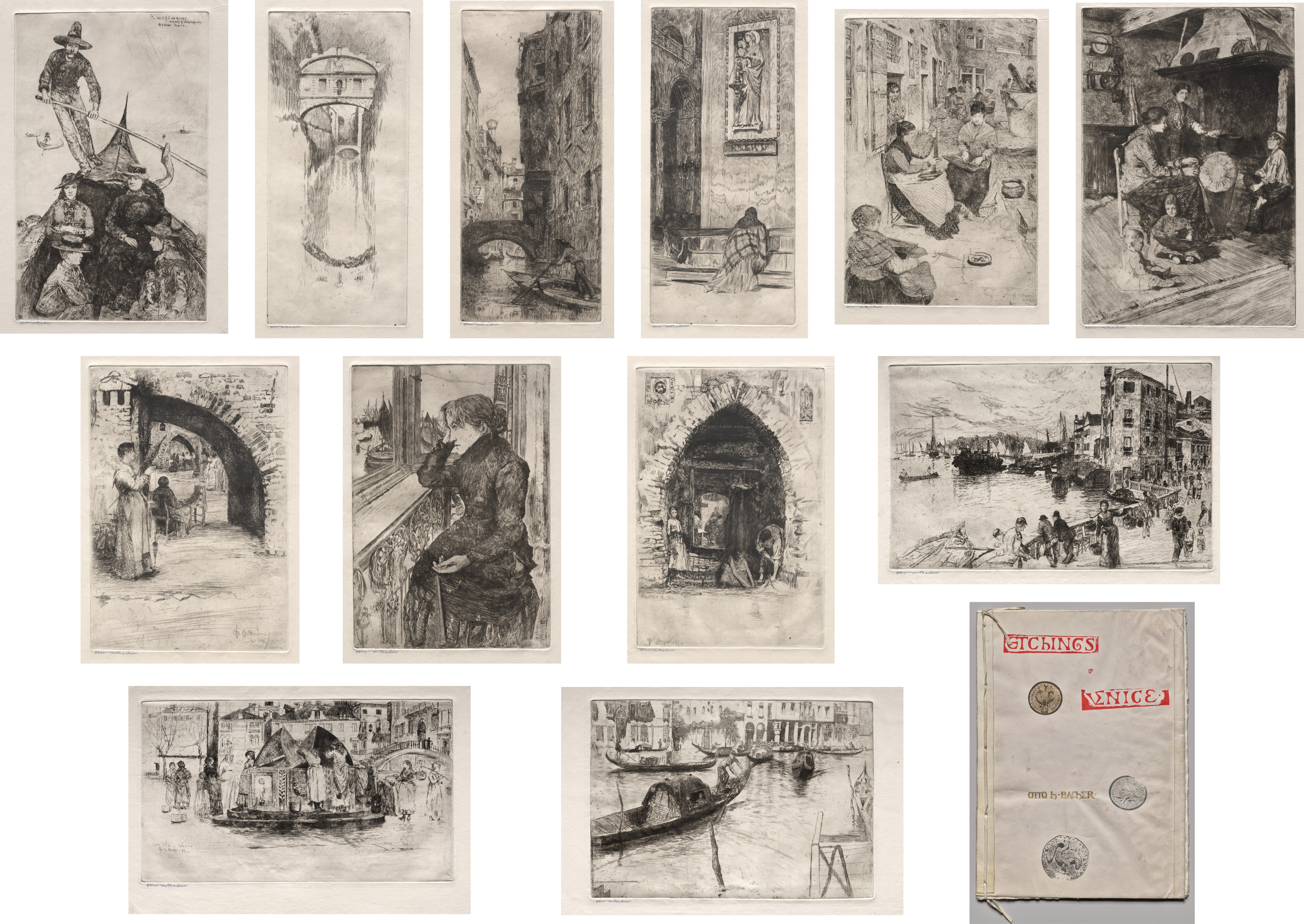 Twelve black and white sketches arranged in three rows. The top row has five sketches, the middle row has four sketches, and the bottom row has three sketches. The sketches depict scenes of Venice, including people in streets and on boats, as well as buildings and archways. A book with a white cover and red text that reads "ETCHINGS OF VENICE" is placed to the bottom right of the sketches.